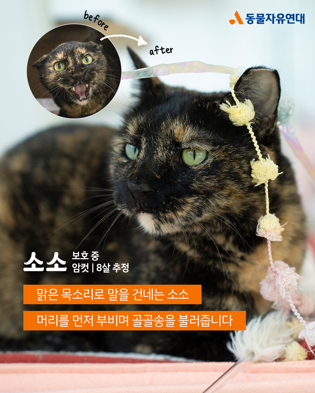 소소 : 초반의 긴장하던 모습은 사라지고, 이제는 맑은 목소리로 말을 건넵니다. 사람 손에 머리를 먼저 부비며 골골송을 불러줍니다.
