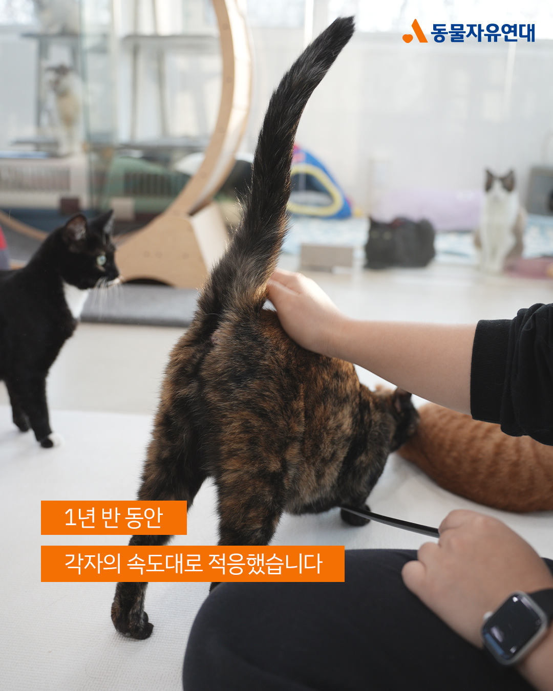 남은 8마리 고양이들은 온캣에서 긴장하기도 하고, 바로 활동가를 반기기도 하며 각자의 속도로 적응했습니다. 다행스럽게도 오디는 평생가족을 만나 사랑받고 있습니다. 새로운 삶을 안겨주셔서 감사합니다!