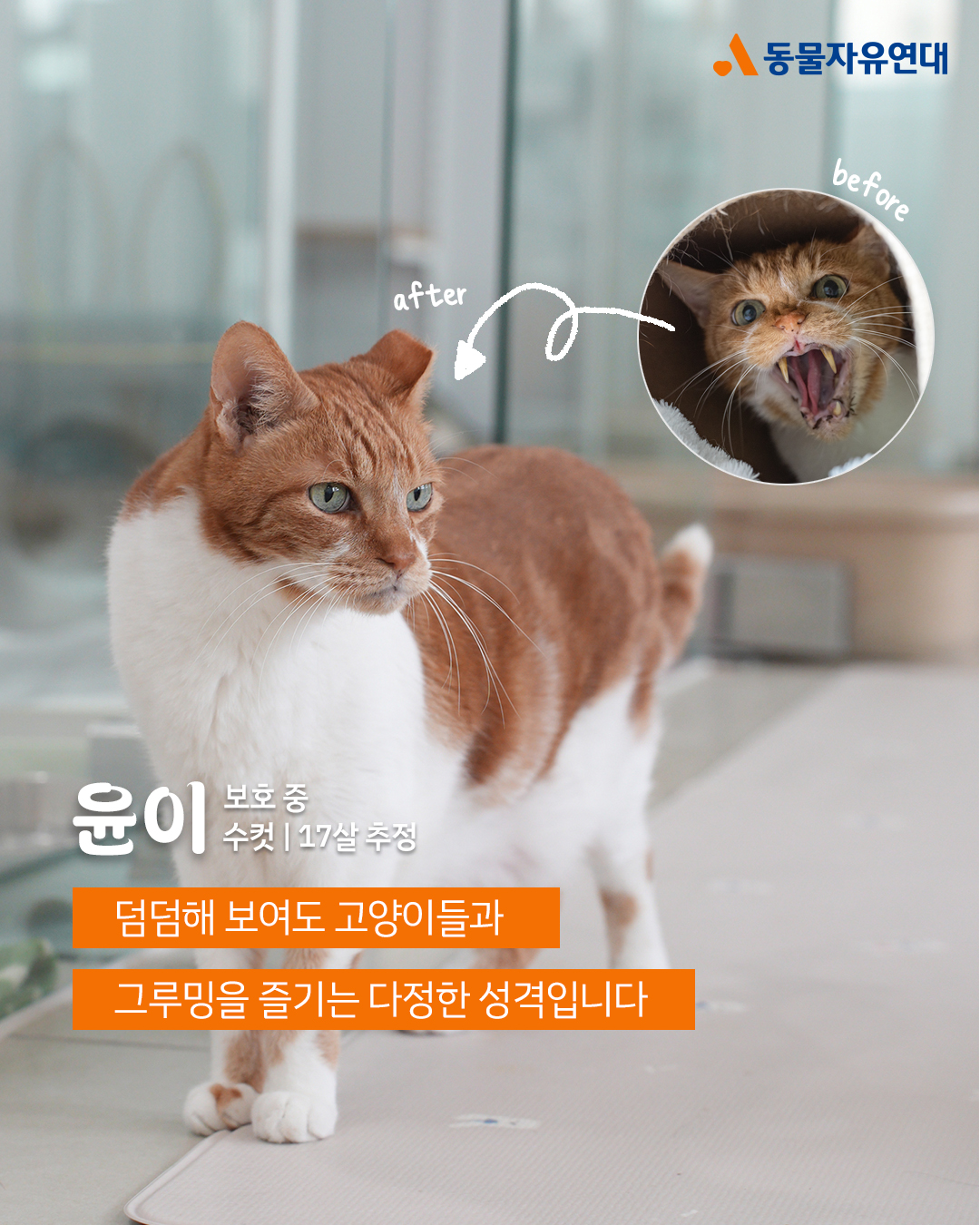 윤이: 덤덤해 보이지만 다른 고양이들과 친해요. 어느새 다른 방에 가서 서로 그루밍을 해줄 정도로 다정합니다.