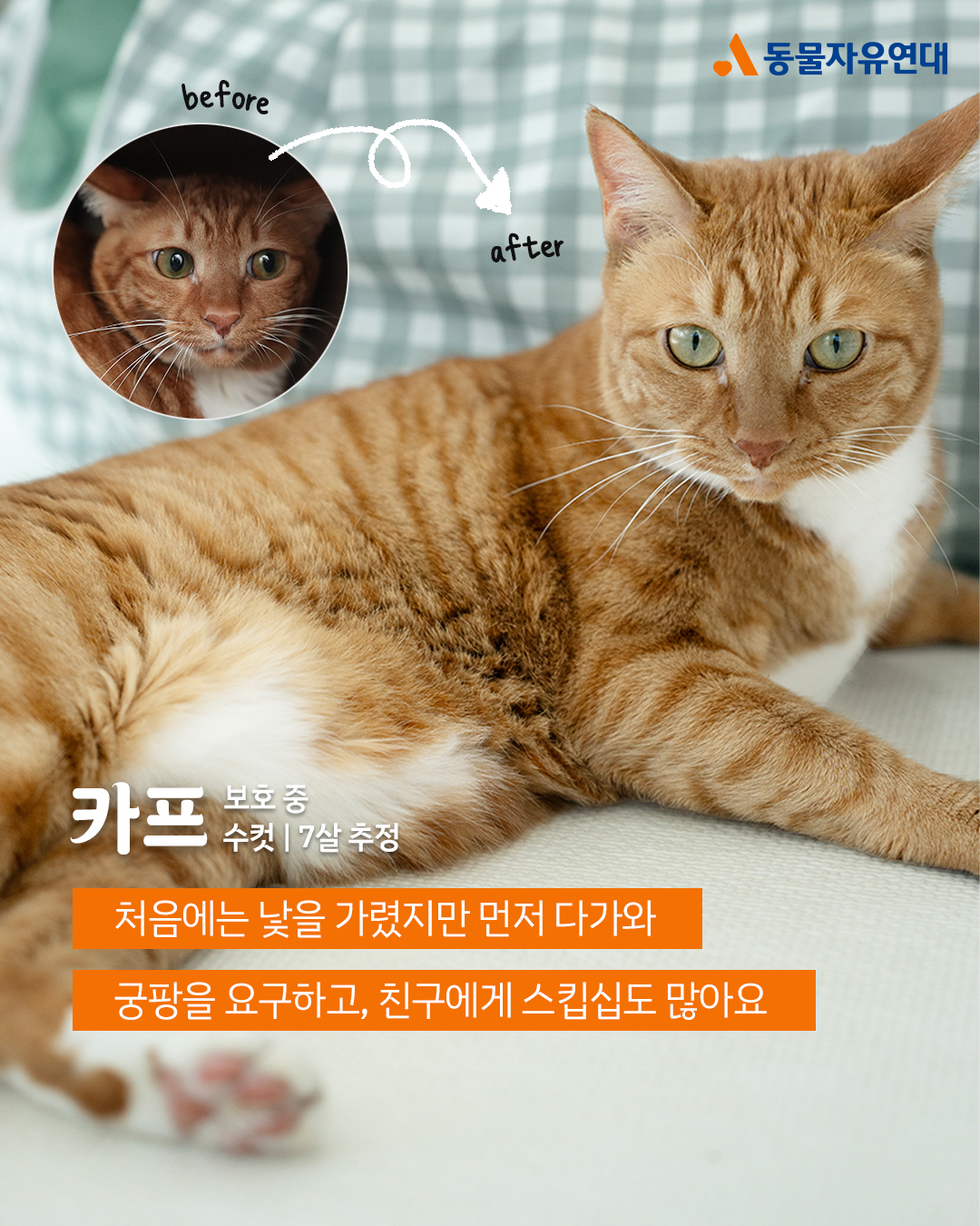 고동이, 체다, 소소, 카프, 하연이, 연이, 윤이가 입주한 지 1년 반 정도가 지났습니다. 그동안 어떤 고양이는 마음을 열어 먼저 다가오기도 하고, 어떤 고양이는 여전히 경계심이 많습니다. 사실 온캣에서 보여주는 모습은 단편적인 부분일 뿐입니다. 가정에서 온전한 애정을 받게 되면, 더욱 마음을 열어갈 수 있습니다. 어떤 모습이든 있는 그대로의 모습을 사랑해줄 가족을 기다립니다.