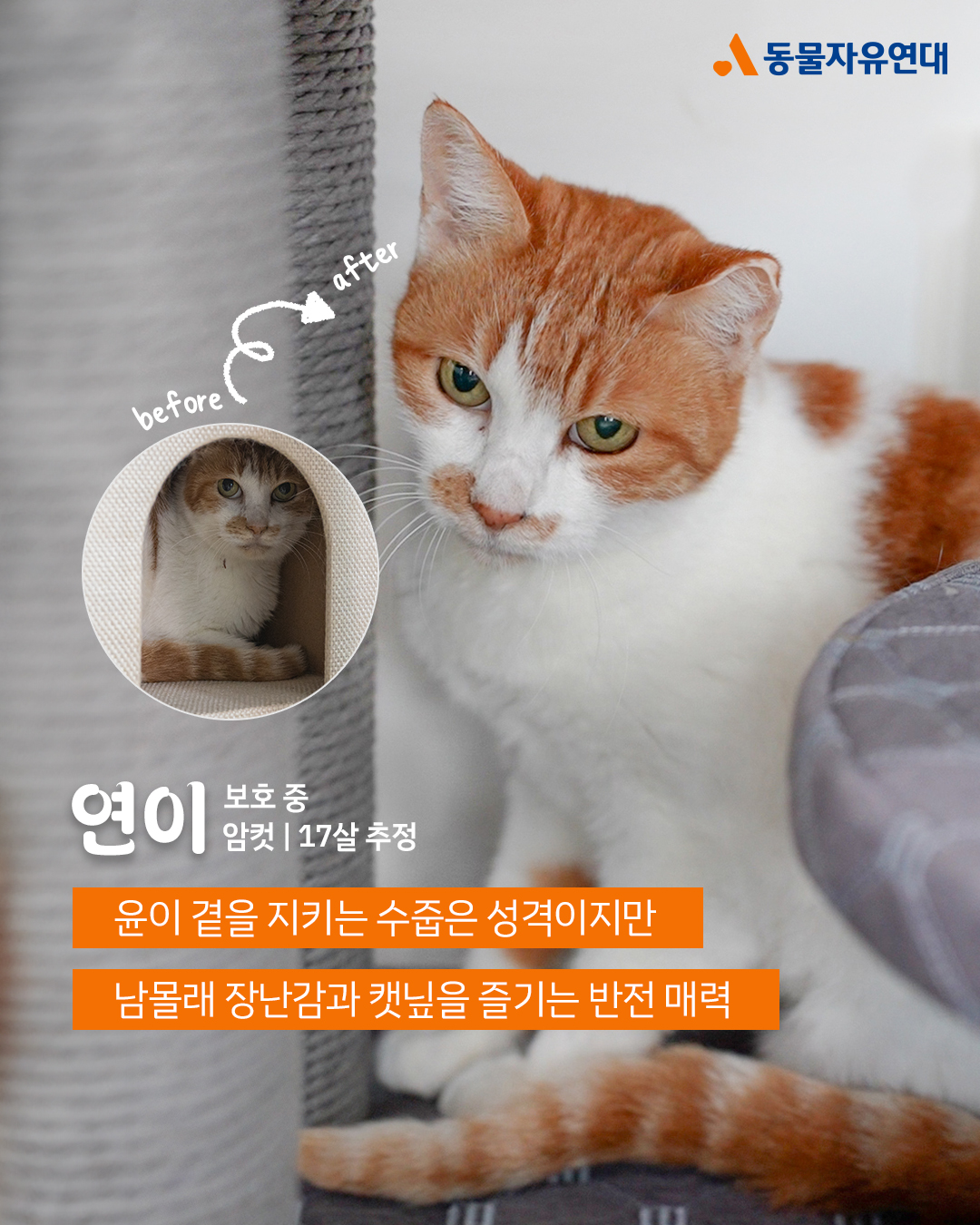 연이: 아직 사람에게 다가가는 건 무서워 단짝 윤이와 항상 꼭 붙어 있습니다. 하지만 남몰래 장난감이나 캣닢을 신나게 즐깁니다.