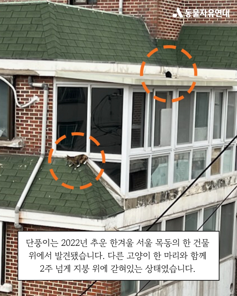 단풍이는 2022년 추운 한겨울 서울 목동의 한 건물 위에서 발견됐습니다. 다른 고양이 한 마리와 함께 2주 넘게 지붕 위에 갇혀있는 상태였습니다.