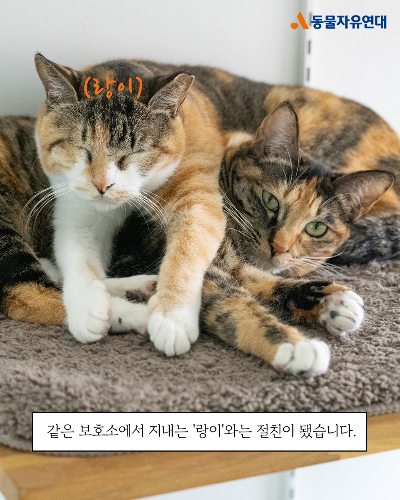 같은 보호소에서 지내는 '랑이'와는 절친이 됐습니다. 밤사이 닫아놓은 방문이 열리면 후다닥 달려가 잘 잤냐고 인사하기 바쁘답니다.