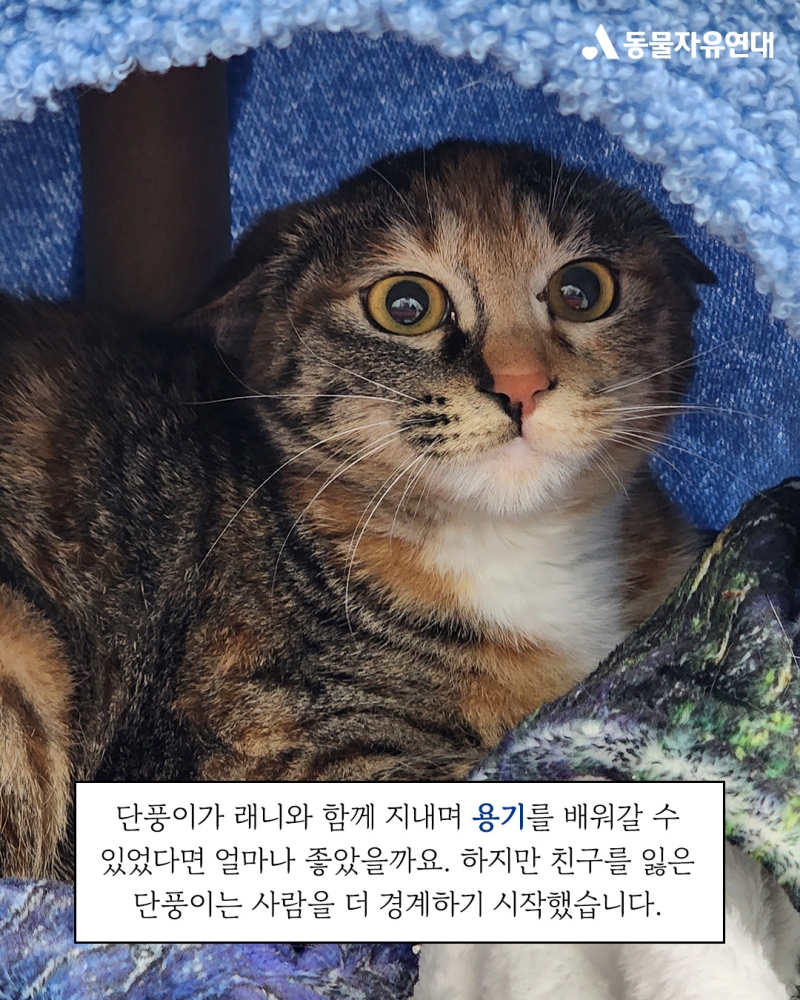 경계심 많은 단풍이와 달리, 같이 구조된 '래니'는 활발하고 호기심 많은 고양이였습니다. 하지만 안타깝게도 래니는 구조된 지 얼마 지나지 않아 세상을 떠나고 말았습니다.