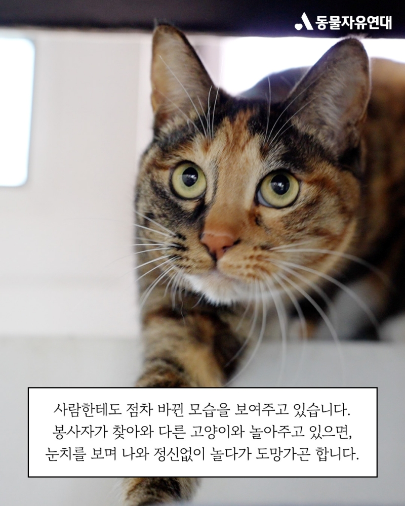 사람한테도 점차 바뀐 모습을 보여주고 있습니다. 봉사자가 찾아와 다른 고양이와 놀아주고 있으면, 단풍이도 나가서 놀고 싶어 눈치를 보다 후다닥 튀어나와 정신없이 놀다 도망가곤 합니다.