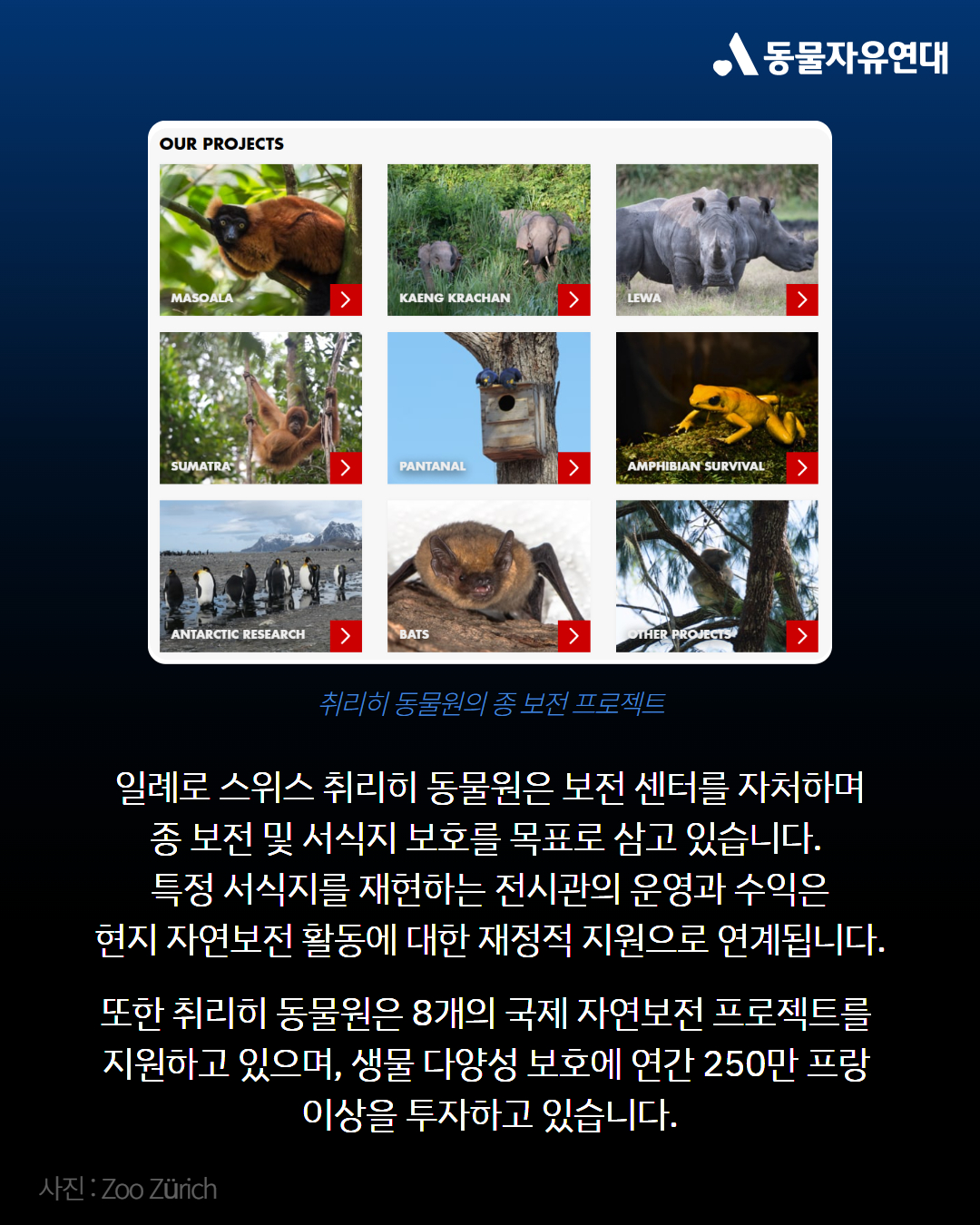 동물원은 야생에서는 관찰이 어려운 종의 기초 생물학을 연구해 야생 보전에 기여할 수 있는 공간입니다. 그러나 각 개체는 연구와 생태교육을 위해 자신의 삶을 공유해주는 존재이므로 동물원은 최고의 복지를 제공해야 합니다. 해외에서는 동물원이 문화· 관광·휴게시설이기보다 연구·보전·교육 기관이라는 법적 정체성을 가지고 있습니다. 이에 따라 단순 전시를 넘어서 야생 서식지 보전 프로젝트의 ‘자금·기술·인력 허브’를 운영하며 현장과 지속적으로 연결되는 보전 모델을 구현하고 있습니다.