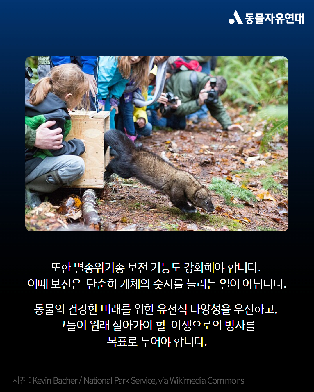 동물원은 서식지가 파괴되었거나 상처를 입은 동물, 불법거래에서 구조된 동물들을 보호하는 보호소 역할을 수행해야 합니다. 또한 동물원은 멸종위기 종 보전 기능을 강화해야 합니다. 이때 종 보전 곧 유전적 보전은 단순히 개체의 숫자를 늘리는 일이 아닙니다. 각 개체의 복지와, 건강한 미래를 위한 유전적 다양성이 우선되어야 합니다. 궁극적으로 동물이 진짜 살아갈 장소인 야생으로의 방사가 목표가 되어야 합니다.
