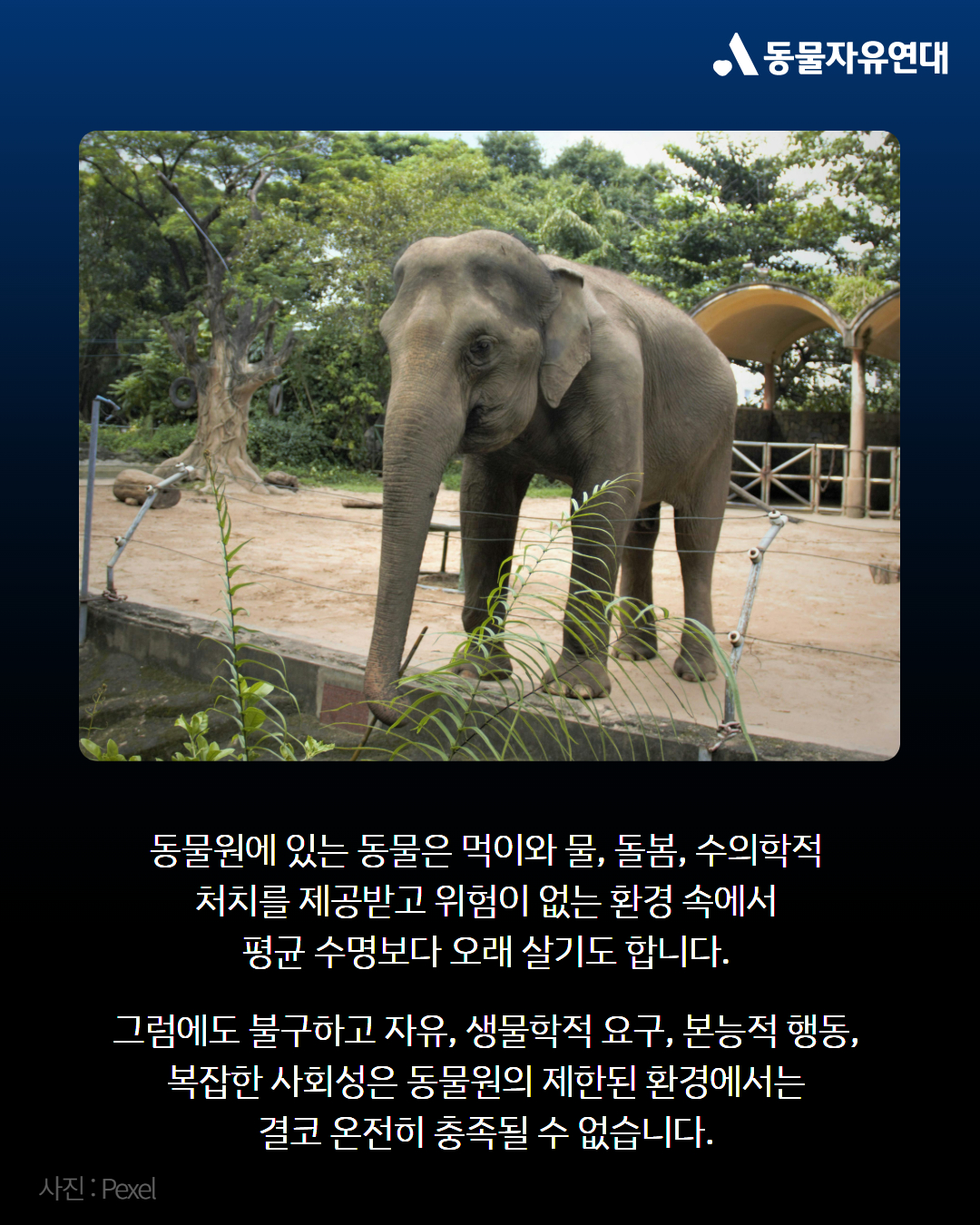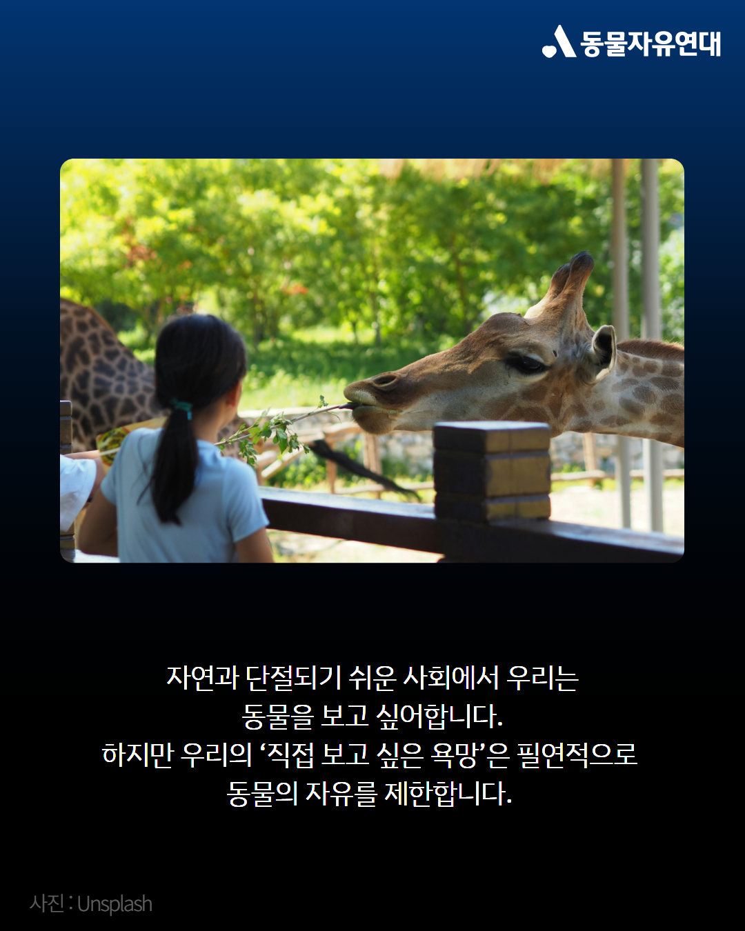 동물원은 단순히 인간의 유희를 위해 동물을 '전시'하는 공간이 아닙니다. 우리는 동물원의 정체성을 바꿔나가며 동물원을 인간 사회가 동물에게 지는 책임을 실천하는 곳으로 만들고, 언젠가는 동물원이 필요 없는 사회를 향해 나아가야 합니다. 동물자유연대는 동물원이 동물에 대한 인간의 책임을 다하는 사회를 만들기 위해 고민과 행동을 멈추지 않겠습니다.