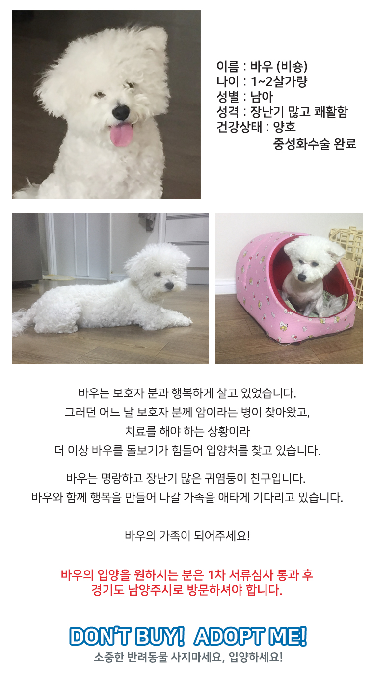 안녕하세요. 동물자유연대입니다. 바우는 입양 연결중이였으나 입양자분의 사정으로 캔슬된 상태입니다. 입양 원하시는 분들은 신청서 작성해주시면 연락드리겠습니다.