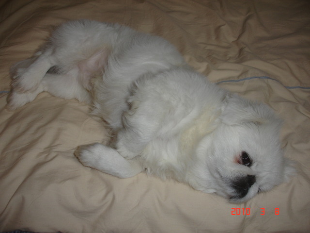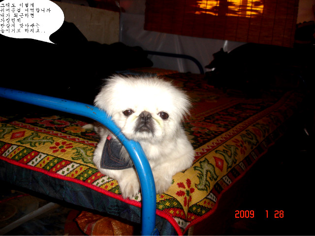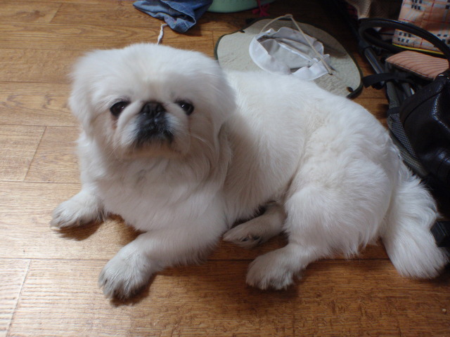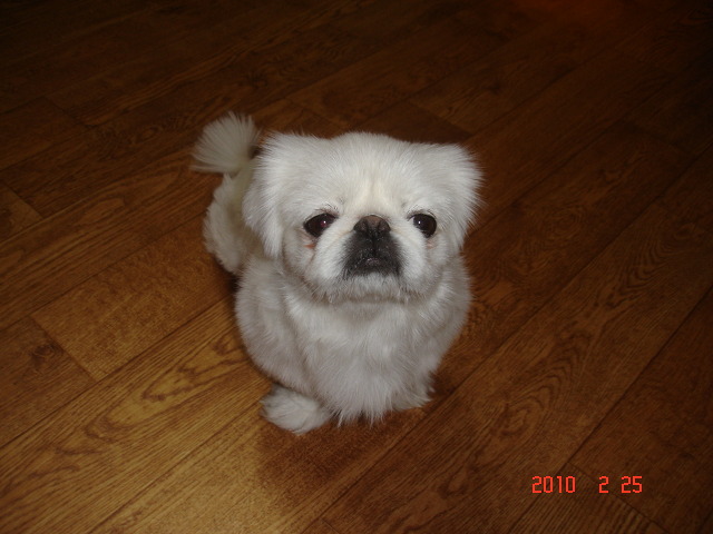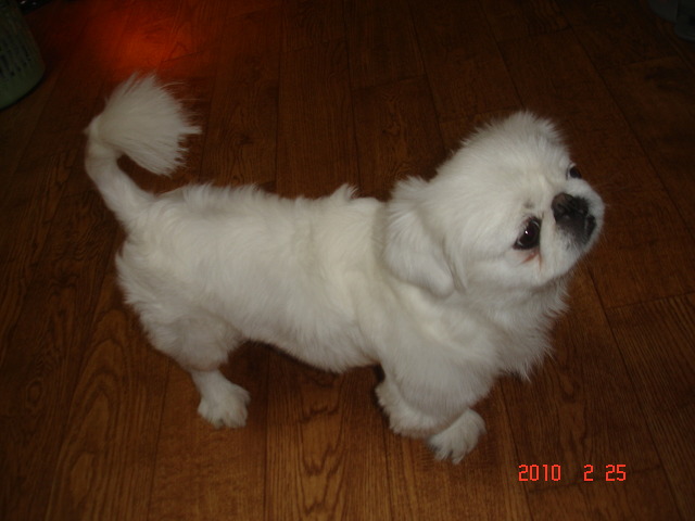 특징: 순백색 페키니즈(푸키)로서 약간 통통한 편이고 아주 잘 생겼습니다.