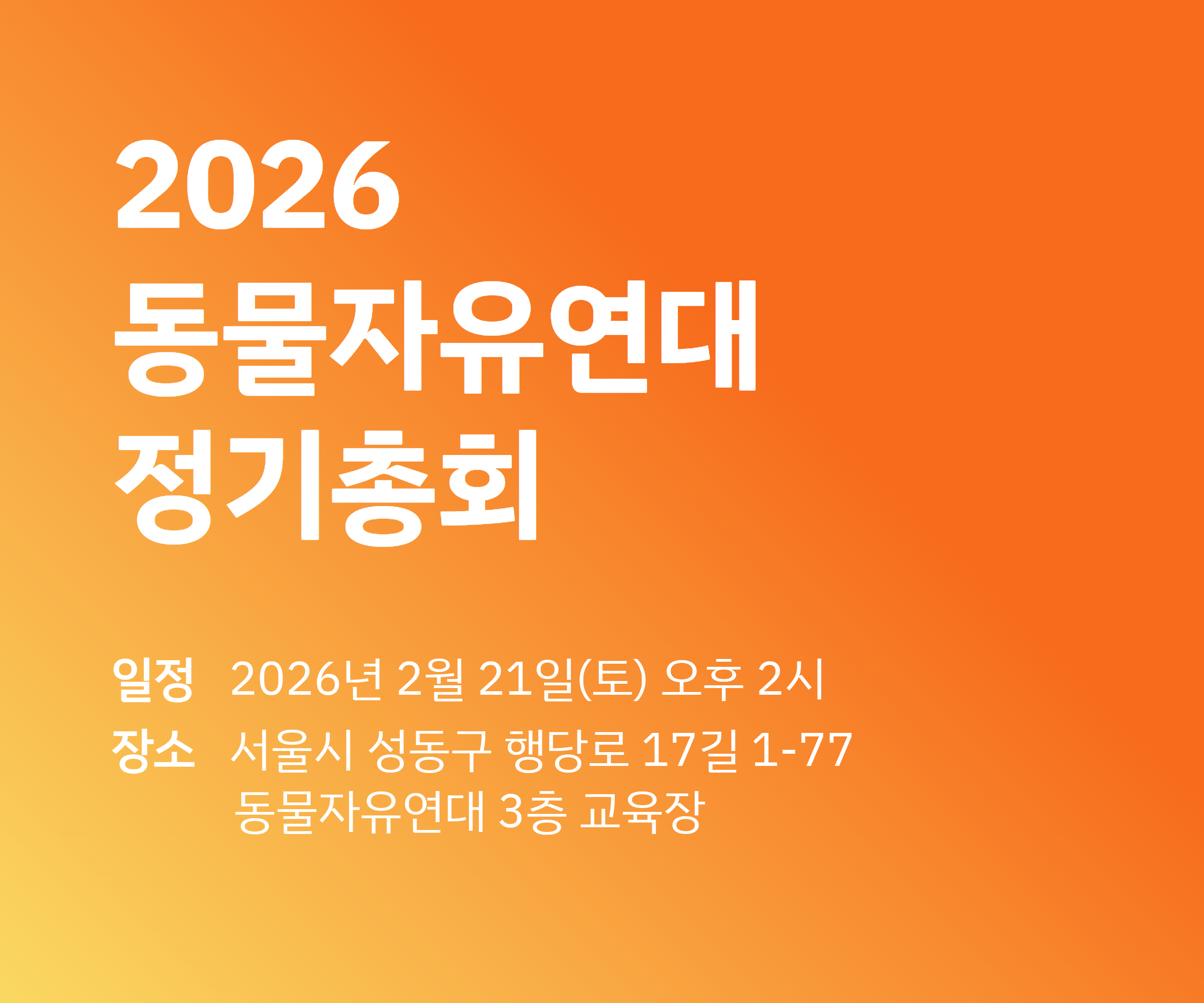 사단법인 동물자유연대는 2026년 정기총회를 개최하고자 합니다.