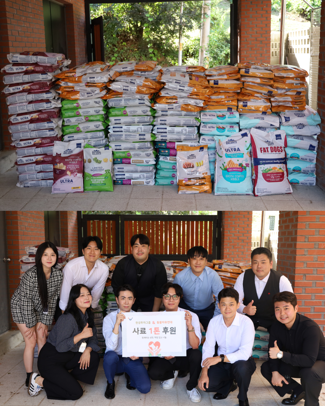 ○ 주식회사 한강투자그룹(대표이사 남영욱)이 9월 18일 사단법인 동물자유연대(대표이사 조희경)의 동물보호소인 ‘온독’에서 구조동물 보호를 위한 사료 기부 전달식을 진행했다. 이번 기부는 강아지 사료 800kg, 고양이 사료 200kg 등 총 1톤 규모로, 보호소에서 생활하는 구조동물들의 건강한 삶을 지원하기 위한 취지다.