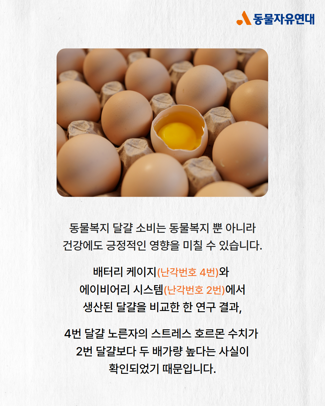 동물복지 달걀을 바로 알고 소비하는 것은 동물복지 뿐 아니라 건강에도 긍정적인 영향을 미칠 수 있습니다. 배터리 케이지(난각번호 4번 달걀)와 에이비어리 시스템(난각번호 2번 달걀)에서 생산된 달걀을 비교한 한 연구 결과, 4번 달걀 노른자의 스트레스 호르몬 수치가 2번 달걀보다 두 배가량 높다는 사실이 확인되었기 때문입니다.