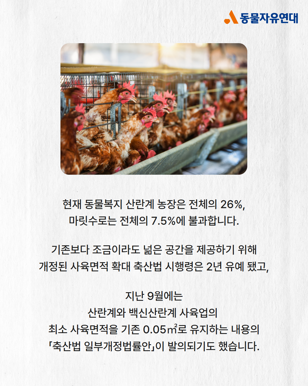 현재 전체 산란계 농장 중 동물복지 인증 농장은 26%에 불과합니다. 마릿수로 비교하면 겨우 7.5%의 닭들만이 배터리 케이지 밖에서 생활하고 있습니다. 이와중에 조금이라도 넓은 공간을 위해 개정된 사육면적 확대 축산법 시행령은 2년 유예되었고, 심지어 지난 9월에는 산란계와 백신산란계 사육업의 최소 사육면적을 기존 0.05제곱미터로 유지하는 내용의 축산법 일부개정법률안이 발의되기도 했습니다.