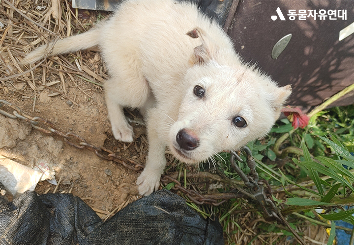 강비는 한 발자국도 제대로 움직이지 못한 상태였습니다. 한 뼘 남짓한 쇠사슬에 묶여 있어 몸을 돌리는 것조차 어려웠고, 뜨거운 땡볕 아래에서 물 한 모금 마시지 못한 채 방치되어 있었습니다. 사람이 다가오자 강비는 오히려 그 곁으로 가고 싶다는 듯 발버둥을 쳤습니다. 하지만 목줄은 강비의 몸을 더 세게 죄었고, 아무리 당겨도 그 자리를 벗어날 수는 없었습니다. 강비는 그 시간 속에서, 움직일 수 없는 몸으로 하루를 버티고 있었습니다.