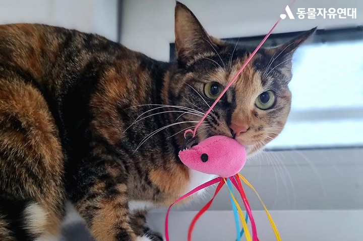 사람한테도 점차 바뀐 모습을 보여주고 있습니다. 봉사자가 찾아와 다른 고양이와 놀아주고 있으면 단풍이도 나가 놀고 싶어 눈치를 보기 시작하는데요. 망설이다 후다닥 튀어나와 정신없이 놀고 다시 도망가 버리곤 합니다.