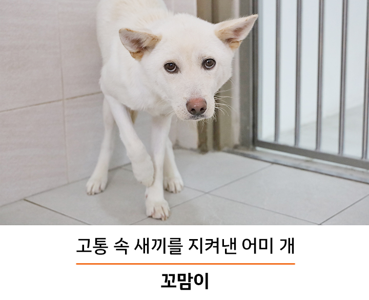 당시 꼬맘이 구조 과정에서 비닐하우스 안 적재된 물건들 사이로 아직 눈도 뜨지 못한 새끼 강아지 여섯 마리가 함께 발견되었습니다. 극심한 통증과 추위 속에서도 어미 개 꼬맘이는 새끼들을 품어 지켜내고 있었습니다. 보호받기 어려운 환경이었지만, 어미와 새끼들은 서로의 체온에 의지해 간신히 생명을 이어가고 있었던 것으로 보입니다.