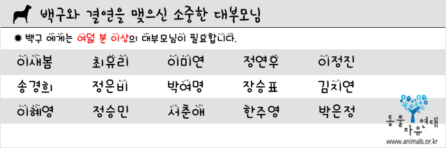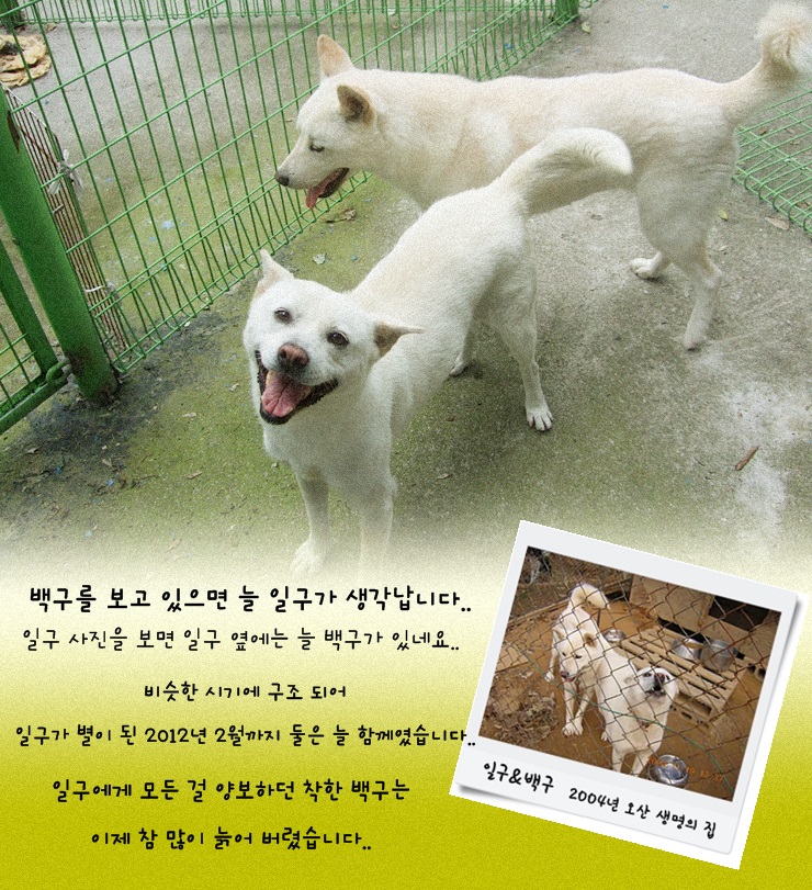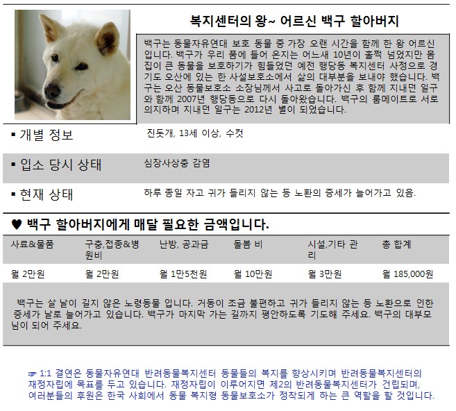 백구와 같은 녀석들이 안전하게 보호받을 수 있는 것은 후원이 없으면 불가능한 일입니다.