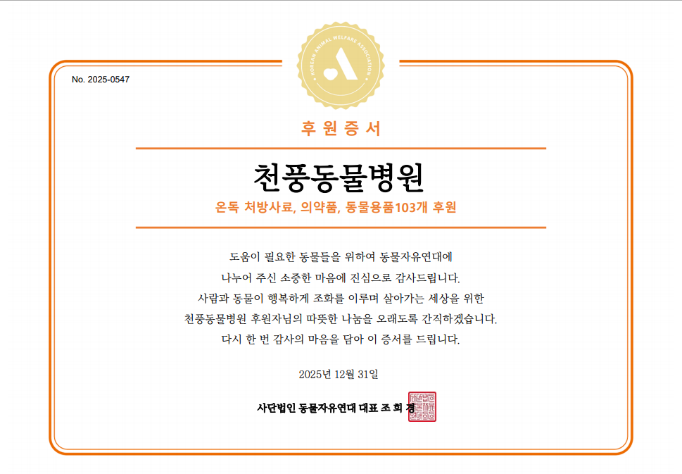 천풍동물병원의 따뜻한 후원 덕분에 동물자유연대 동물들이 건강하게 겨울을 보낼 것 같습니다🎁