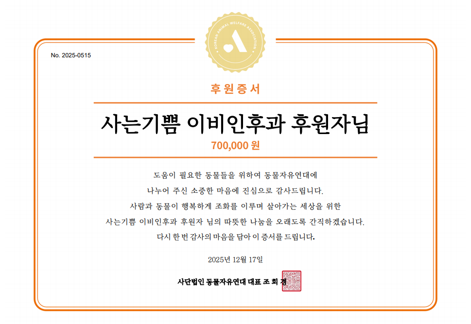 지난 12월 , 사는기쁨 이비인후과에서 동물자유연대로 정기후원을 시작하시며 추가로 일시후원금을 보내주셨습니다.