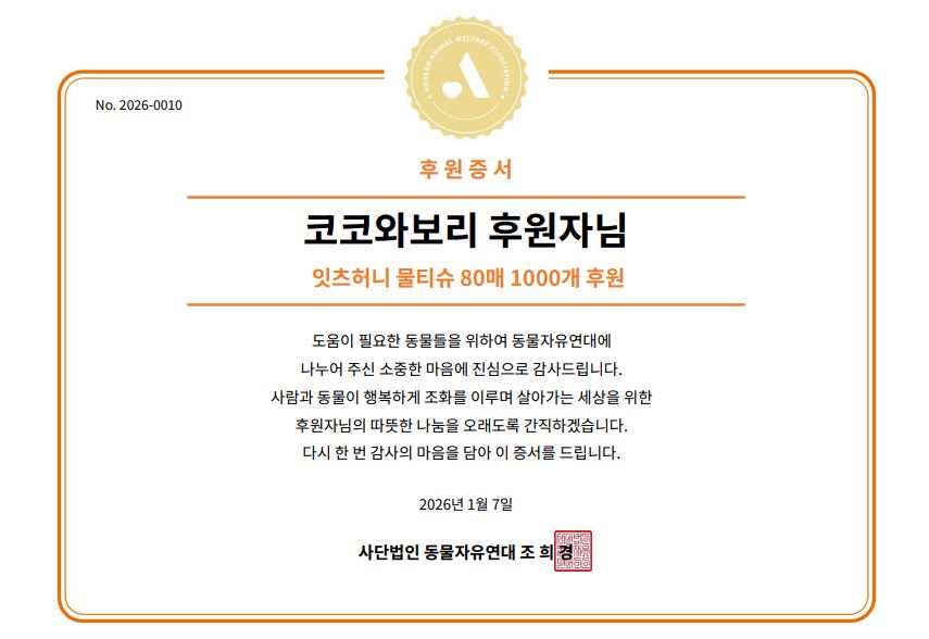 세상 모든 코코와 보리를 위한 마음, 프리미엄 반려동물 용품 브랜드 코코와보리에서 동물자유연대로 물티슈 1,000개를 후원해주셨습니다🎀