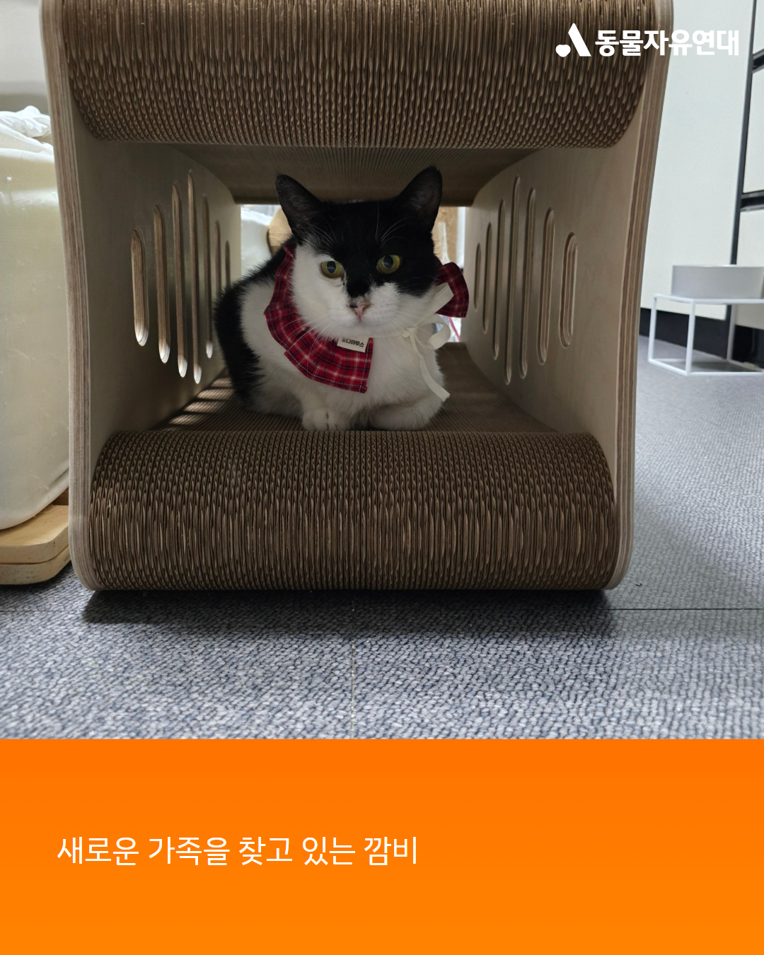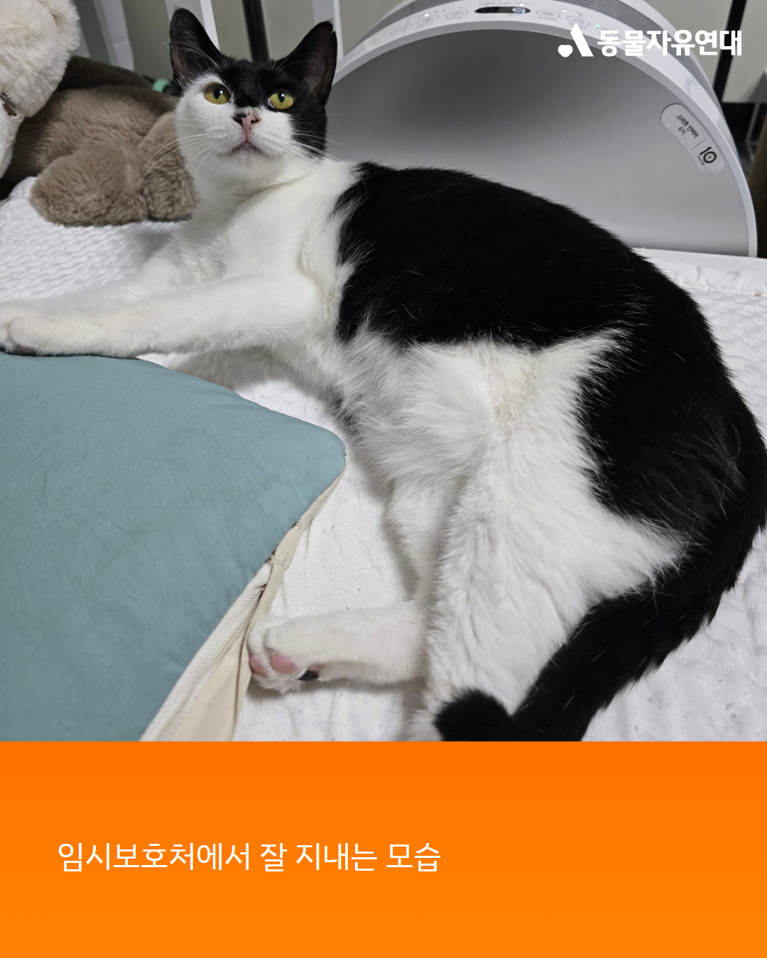 “깜비는 회복을 잘해 주었고 적응도 잘해 주었습니다. 이제 사람 옆에서 잠도 자고 만질 수도 있습니다. 저는 아이들에게 밥 주고 물 주는 일만 했을 뿐 입양 홍보활동을 해 본적이 없어서 자신이 없었는데 도와주시는 분들이 많아 용기를 내서 깜비 입양 홍보를 하고 있습니다. 아기들을 보내고 힘들었을 텐데 잘 적응하는 깜비는 참 대견한 아이입니다. 임시보호처의 고양이들과도 잘 지냅니다. 깜비와 깜비의 아가들이 집에서 안전하게 보호받으며 사랑받으며 살게 돼서 너무 기쁩니다. 이런 기쁨을 갖게 해주신 동물자유연대에 진심으로 감사드립니다.”