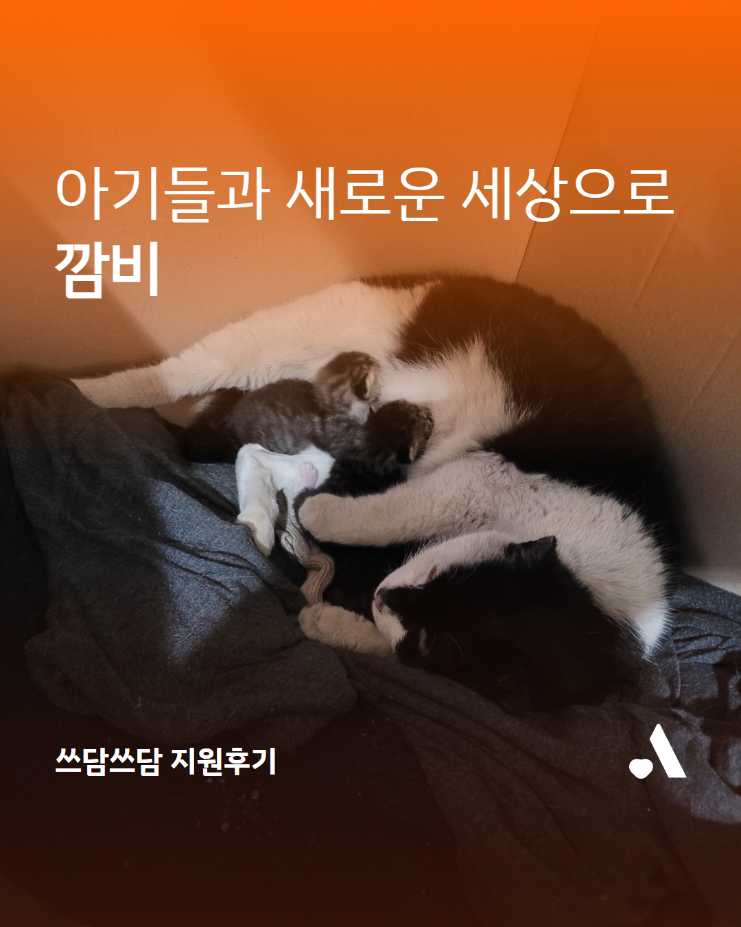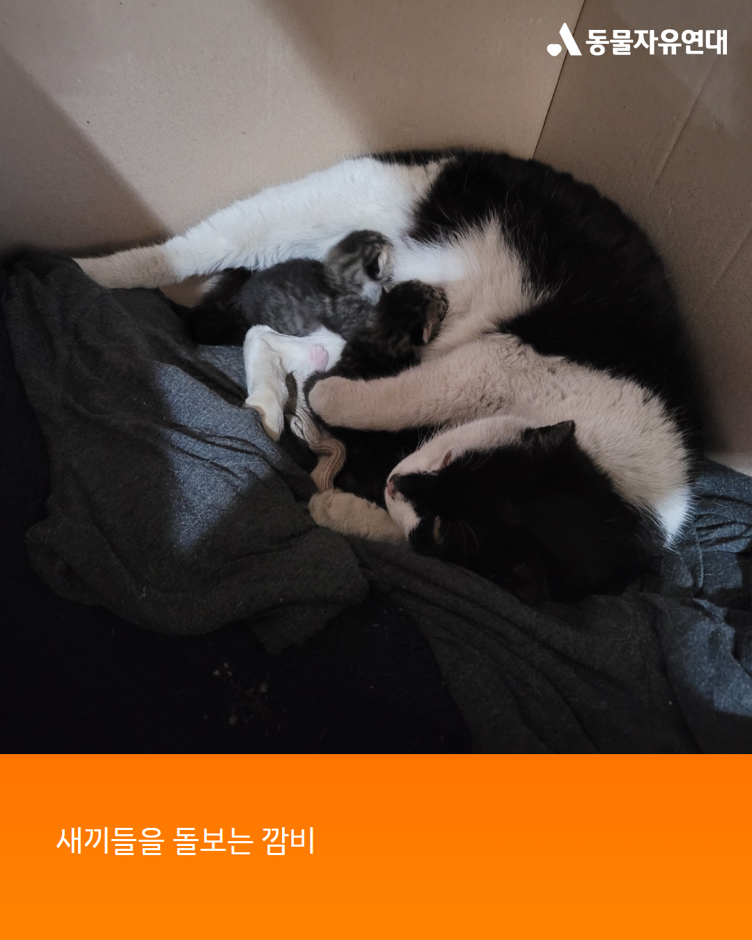 아르바이트하는 편의점 주차장 쪽에 길고양이가 아기 세 마리를 낳았습니다. 아기들을 여기저기 옮기는 듯하더니 주차장 구석에서 아기들을 돌보고 있었습니다. 평소 길고양이들을 돌봐왔던 구조자는 상자로 둥지를 만들어 주고 아기들을 편하게 돌볼 수 있게 밥과 물을 챙겨 주었습니다. 그 길고양이 깜비는 정말 순했고 사람을 잘 따라 더 마음이 쓰였습니다.
