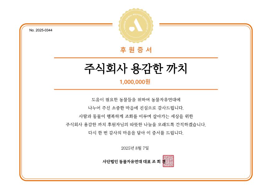 "도서출판 용감한까치"의 대표님은 2024년부터 동물자유연대에 정기후원을 이어오셨고, 최근 "고양이의 날" 을 맞이해 "도서출판 용감한 까치" 의 이름으로 후원금 100만원을 보내주셨습니다.