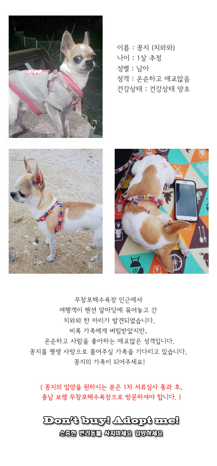 안녕하세요 동물자유연대 사랑입니다. 꽁지는 그냥 치와와가 아닌 단모치와와 입니다. 확인 부탁드립니다.^^