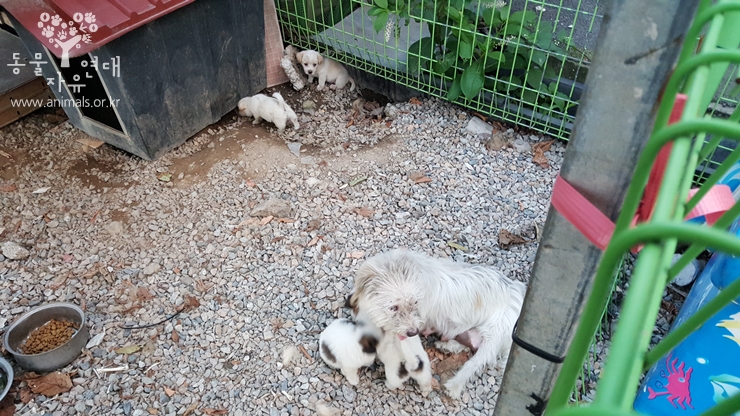 길 위에서 떠돌아 다니던 어미가 출산을 앞두고 김해 장유의 한 공장 인근 쓰레기 더미근처에서 새끼4마리를 출산했습니다.
