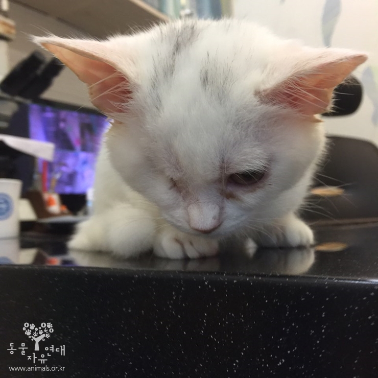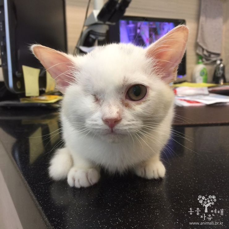 오른쪽 눈이 피고름이 가득차 튀어나올 지경에서 구조된 설이는 구조 후 병원으로 이송되어 안구 적출 수술을 받았습니다.