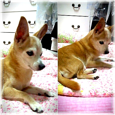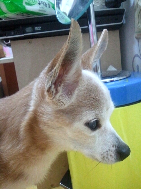 두귀가 완전쫑끗하며, 노루처럼생겼습니다. 전체가 갈색이나 발등은 흰색이며, 왼쪽 앞다리는 다리 반쪽까지만 흰색입니다. 현재 나이가 있어, 백내장이있어 눈알이 뽀얗고, 귀는 잘들리지 않는상태입니다.치아가 없어서 협가 옆으로 살짝나와있는상태입니다. 경계심은 있으나, 현재 몸상태가 좋지않아 사람을 따르기는 할껍니다.