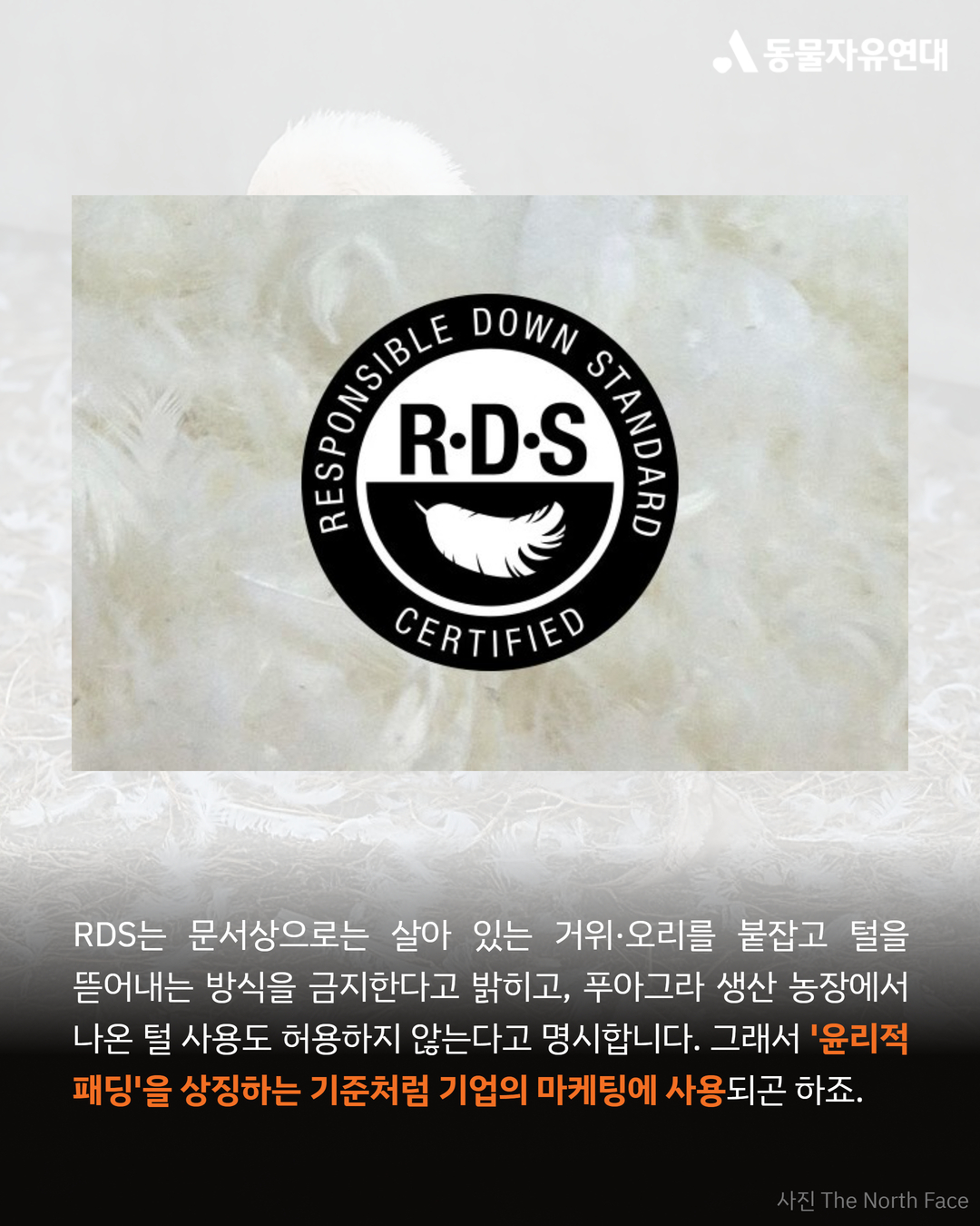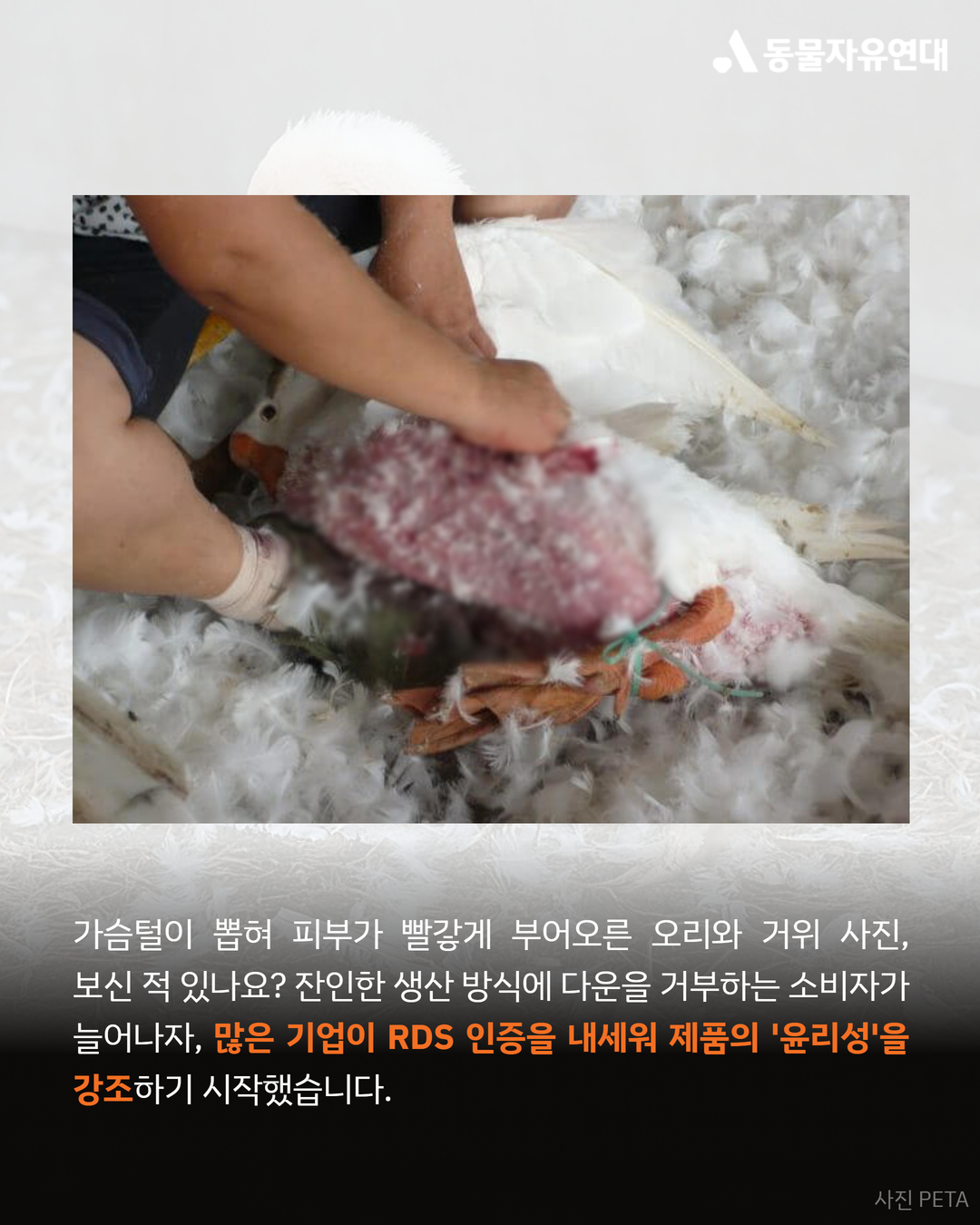 가슴털이 뽑혀 피부가 빨갛게 부어오른 오리나 거위 사진, 한 번쯤 보신 적 있으신가요. 겨울철 패딩의 보온재, 푹신한 침구나 소파, 그 안을 가득 채우는 다운(오리·거위 깃털)은 사실 고통의 산물이었다는 사실이 이제는 널리 알려졌습니다. 열악한 사육 환경과 잔인한 생산 방식에 다운을 거부하는 소비자들이 늘어나자 많은 기업들이 RDS 인증을 내세워 제품의 ‘윤리성’을 강조하기 시작했습니다.