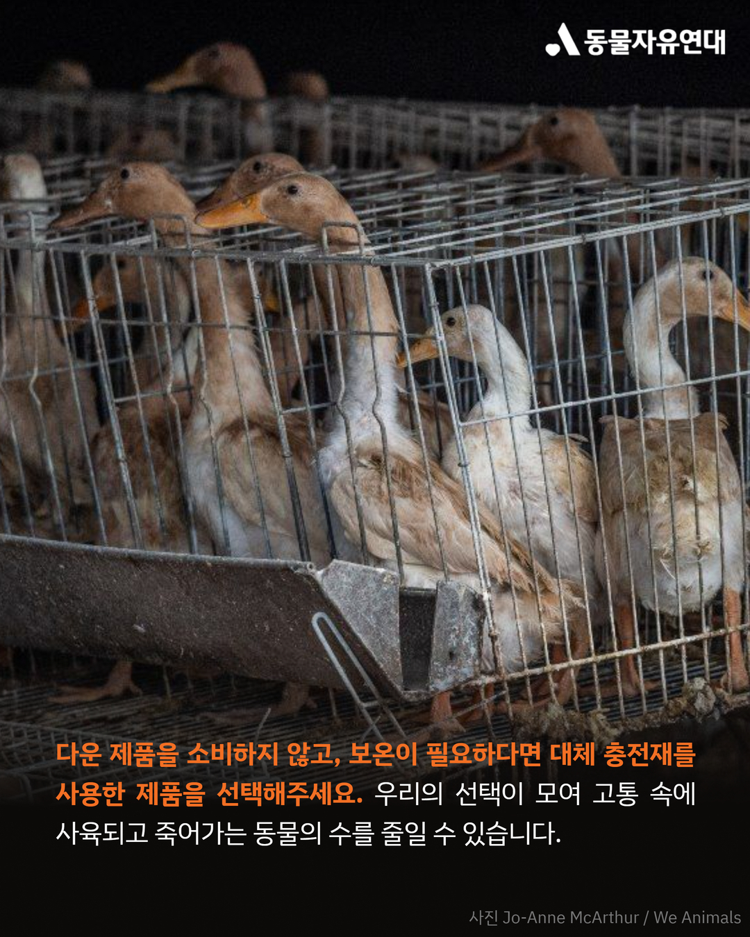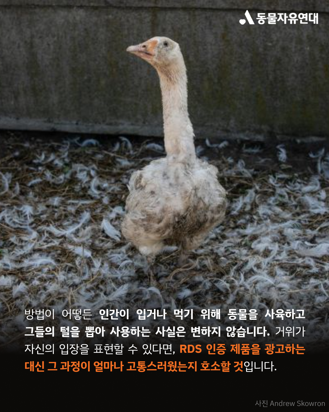 만약 거위가 자신의 입장을 인간의 말로 표현할 수 있었다면, RDS 인증을 받았다는 그 소파를 광고하는 대신 자신의 깃털로 그 안을 채우기까지 얼마나 고통스러운 과정을 겪었는지 호소했을 것입니다. 다운 제품을 소비하지 않고, 보온이 필요하다면 대체 충전재를 사용한 제품을 선택해주세요. 우리의 선택이 모여 고통 속에 사육되고 죽어가는 동물의 수를 줄일 수 있습니다.