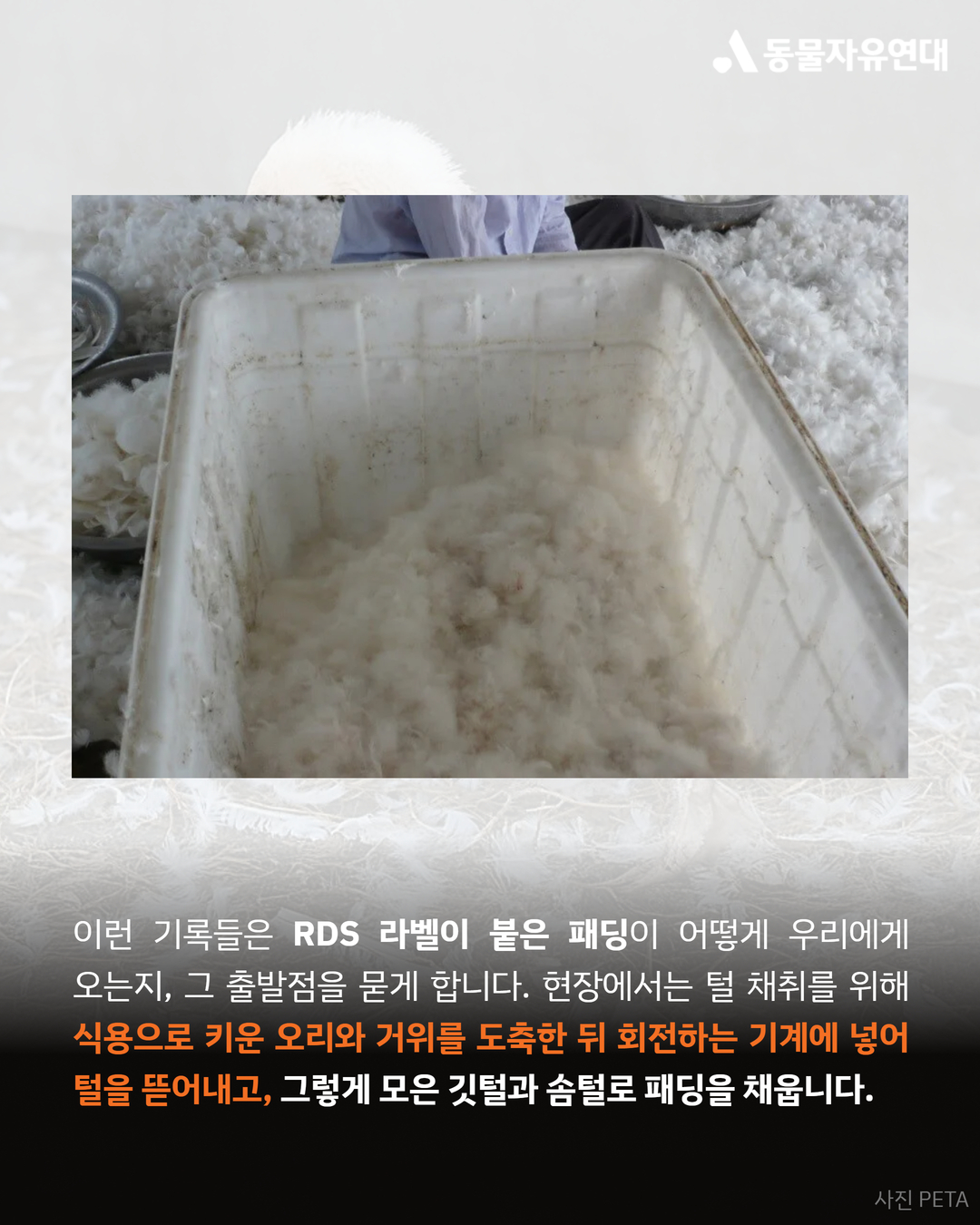 이런 현장의 기록들은 RDS 라벨이 붙은 패딩이 어떤 경로를 거쳐 우리에게 오는지, 그 출발점을 묻게 합니다. RDS 인증 다운이 나오는 현장의 털 채취 방식은 대체로 이렇습니다. ‘식용’으로 키운 오리와 거위를 도축한 뒤 뜨거운 물에 담가 깃털이 잘 빠지게 만들고, 회전하는 기계 속에 넣습니다. 기계 안에서 동물 몸의 털이 뜯겨 나오고, 그 깃털과 솜털을 모아 우리가 입는 패딩 속을 채웁니다.