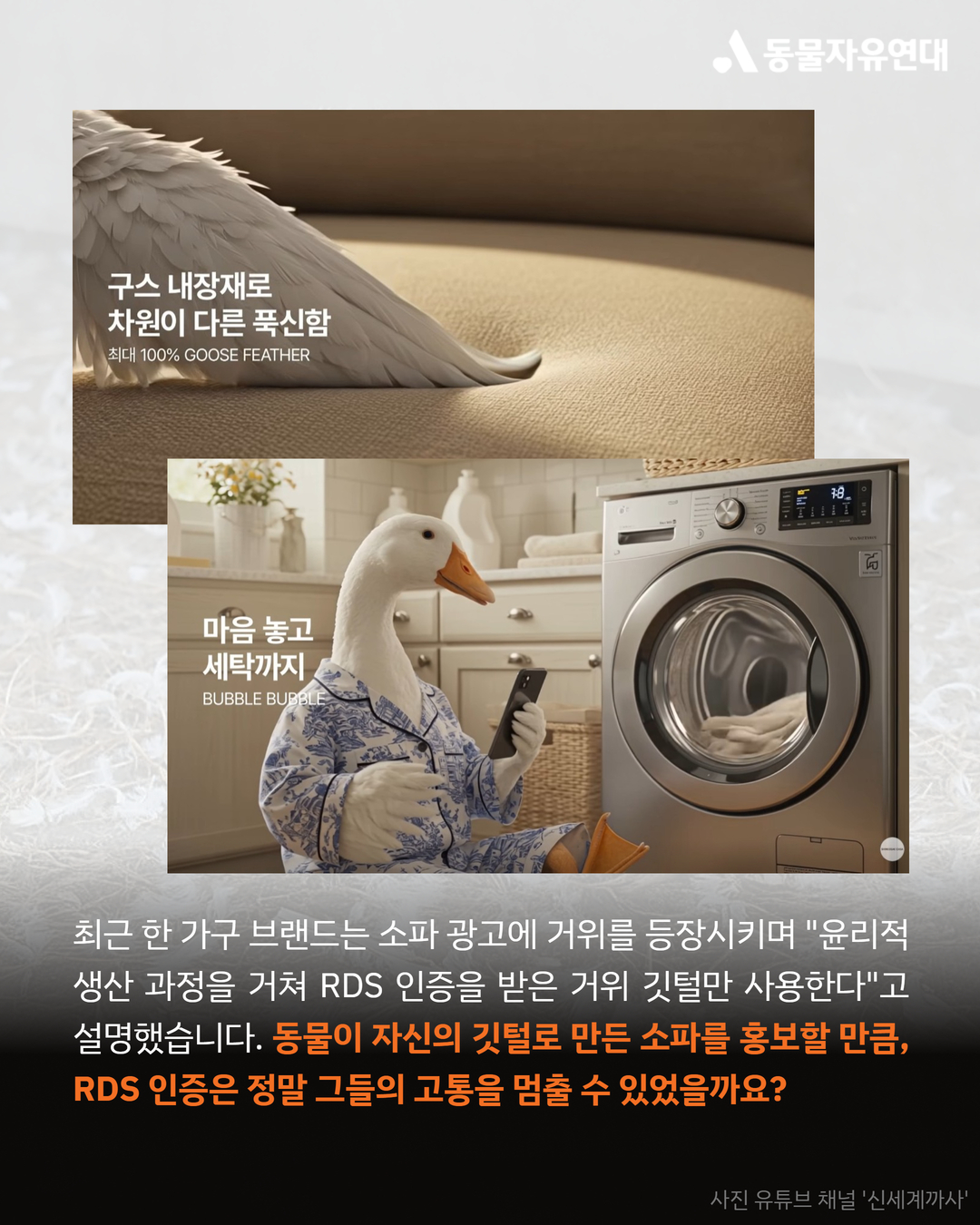 심지어 최근 한 가구 브랜드는 오리털에서 거위털로 소재를 바꾼 소파 광고에 거위를 등장시켜 제품을 쓰다듬고 즐기는 장면을 연출했습니다. 광고의 설명글에는 “윤리적 생산 과정을 거쳐 RDS 인증을 받은 거위 깃털만 사용합니다”라는 문구가 적혀 있습니다. 동물이 자신의 깃털로 만든 소파를 홍보할 만큼 제품이 ‘윤리적으로’ 생산되었다는 이 광고, RDS 인증은 정말 동물의 고통을 멈출 수 있었을까요?