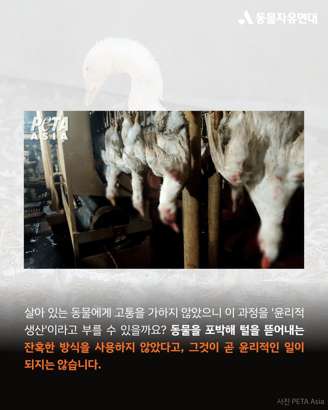 *출처: PETA (2023년 11월 29일). “‘Responsible Down’ Label Humane-Washes Cruelty, Says PETA in Competition Bureau Complaint.”