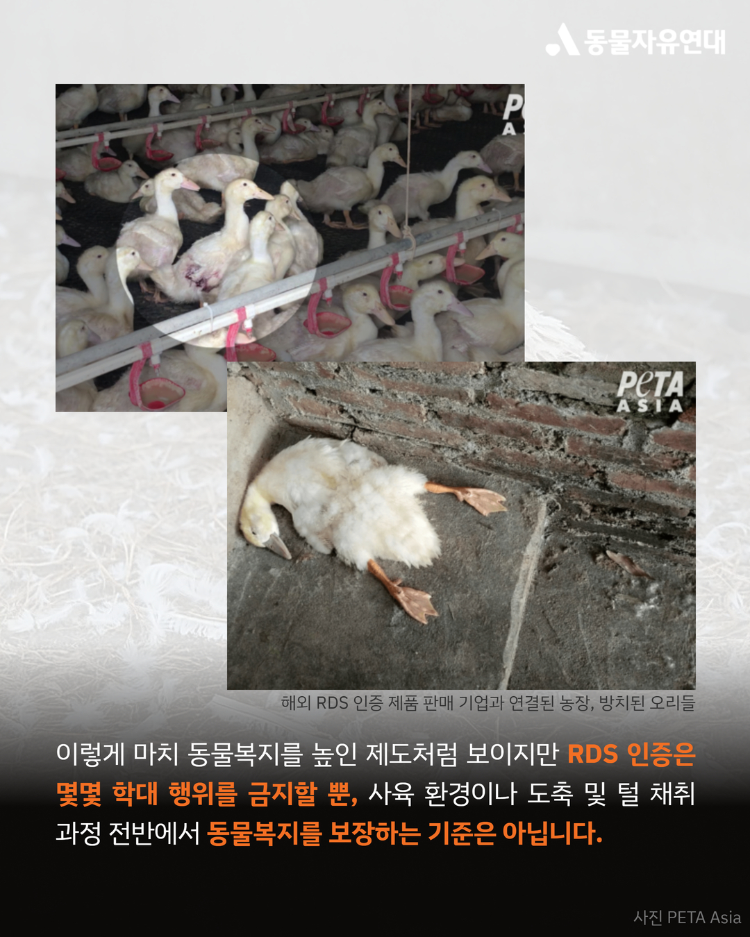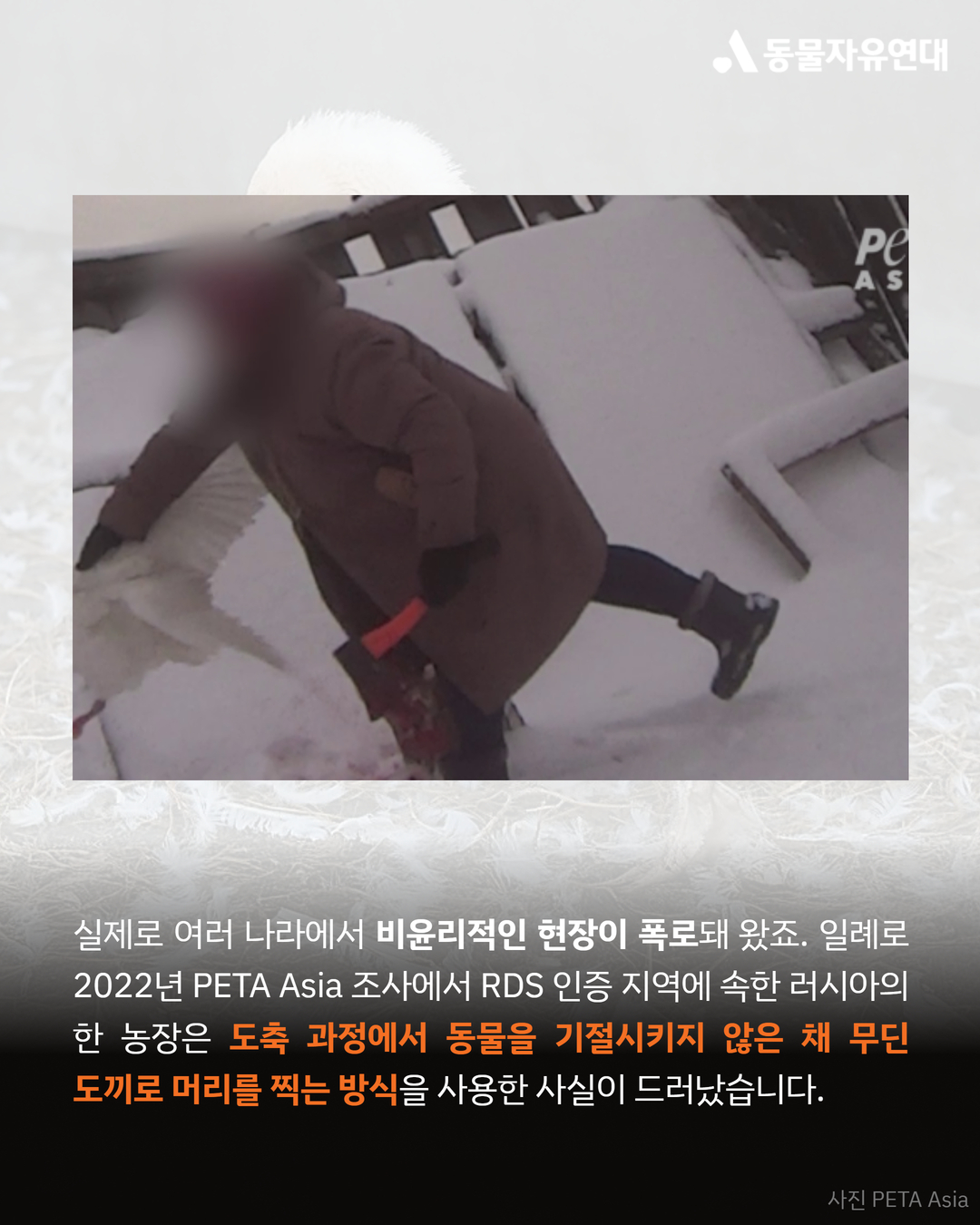 마치 동물복지를 높인 제도처럼 보이지만 RDS 인증은 몇몇 학대 행위를 금지할 뿐, 동물이 잘 살 수 있는 사육 환경이나 도축 및 털 채취 과정 전반에서 동물복지를 보장하는 기준은 아닙니다. 여러 나라에서 실제 현장의 비윤리적인 현실이 폭로돼 왔죠. 일례로 2022년 PETA Asia 조사에서 RDS 인증 지역에 속한 러시아의 한 농장은 자신들이 RDS 관련 농장인지조차 모르고 있었고, 도축 과정에서 동물을 기절시키지 않은 채 무딘 도끼로 머리를 찍어내는 방식을 사용한 사실이 드러났습니다.*