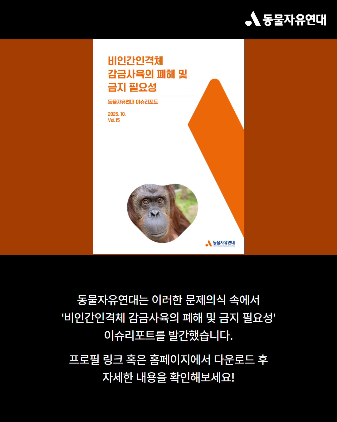 동물자유연대는 이러한 문제의식 속에서 '비인간인격체 감금사육의 폐해 및 금지 필요성' 이슈리포트를 발간했습니다. 다운로드 후 자세한 내용을 확인해보세요!