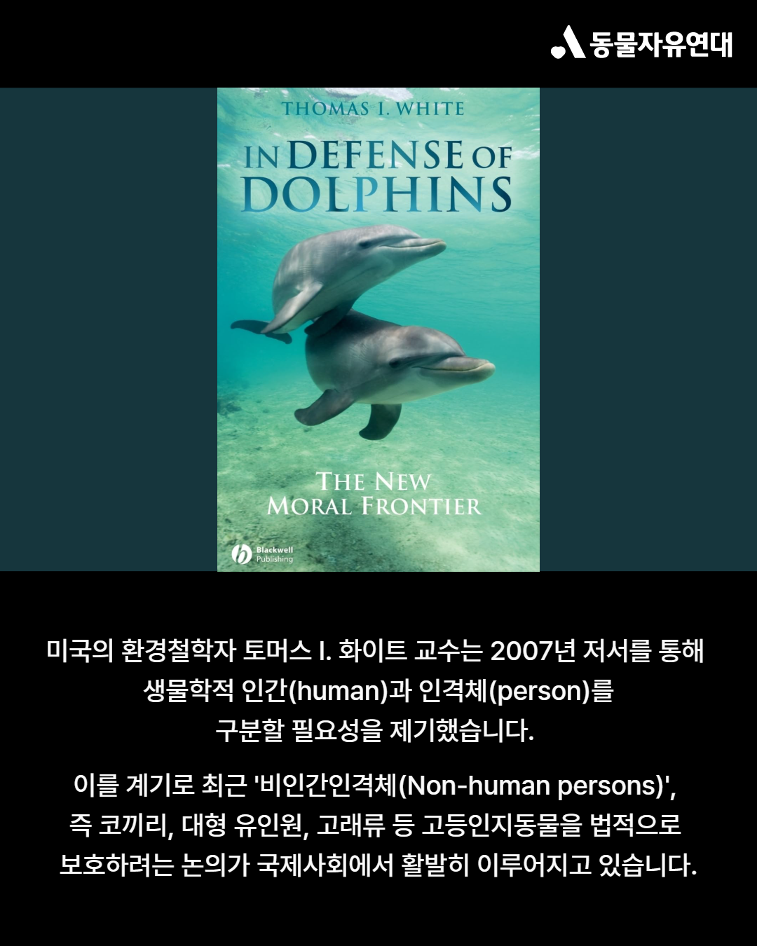 미국의 환경철학자 토머스 I. 화이트 교수는 2007년 저서를 통해 생물학적 인간(human)과 인격체(person)를 구분할 필요성을 제기했습니다. 이를 계기로 최근 '비인간인격체(Non-human persons)', 즉 코끼리, 대형 유인원, 고래류 등 고등인지동물을 법적으로 보호하려는 논의가 국제사회에서 활발히 이루어지고 있습니다.