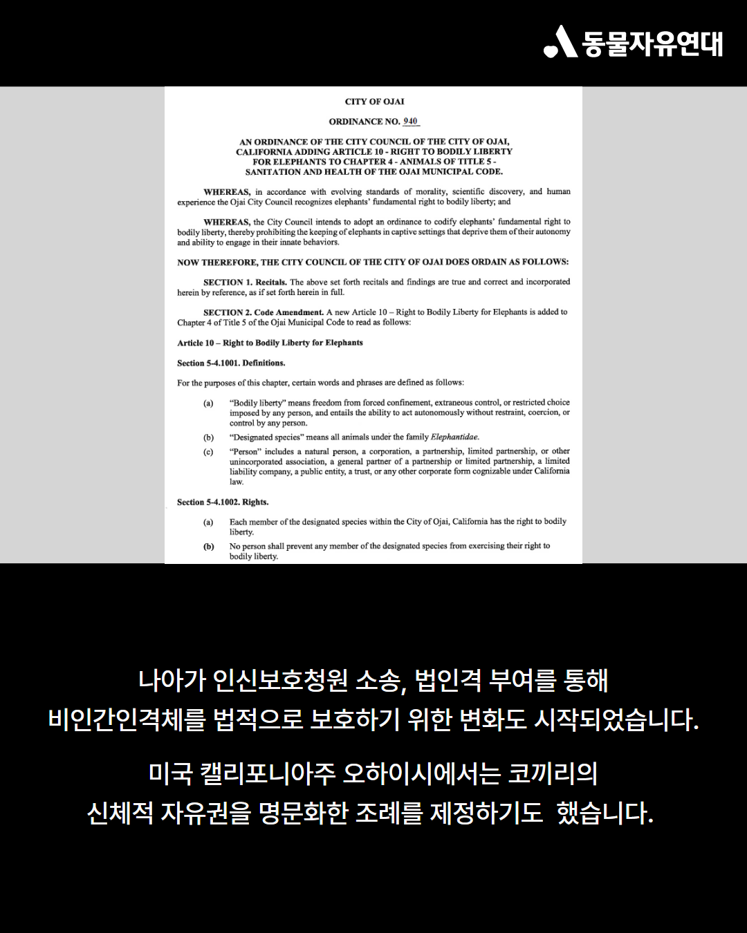 나아가 인신보호청원 소송, 법인격 부여를 통해 비인간인격체를 법적으로 보호하기 위한 변화도 시작되었습니다. 미국 캘리포니아주 오하이시에서는 코끼리의 신체적 자유권을 명문화한 조례를 제정하기도 했습니다.