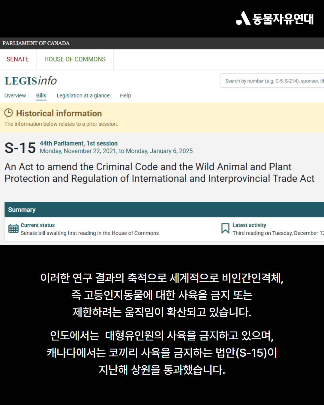 이러한 연구 결과의 축적으로 세계적으로 비인간인격체, 즉 고등인지동물에 대한 사육을 금지 또는 제한하려는 움직임이 확산되고 있습니다. 인도에서는 대형유인원의 사육을 금지하고 있으며, 캐나다에서는 코끼리 사육을 금지하는 법안(S-15)이 지난해 상원을 통과했습니다.