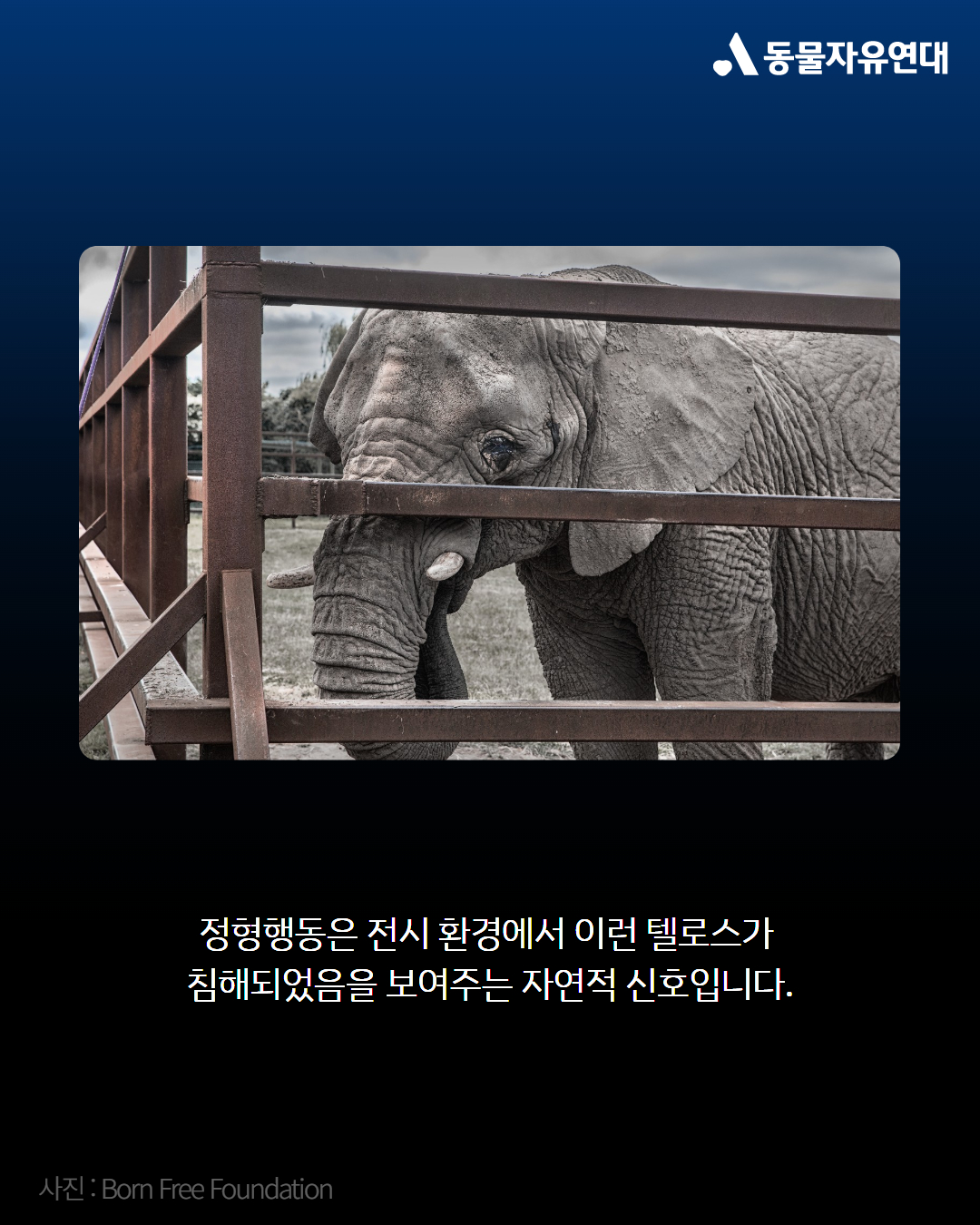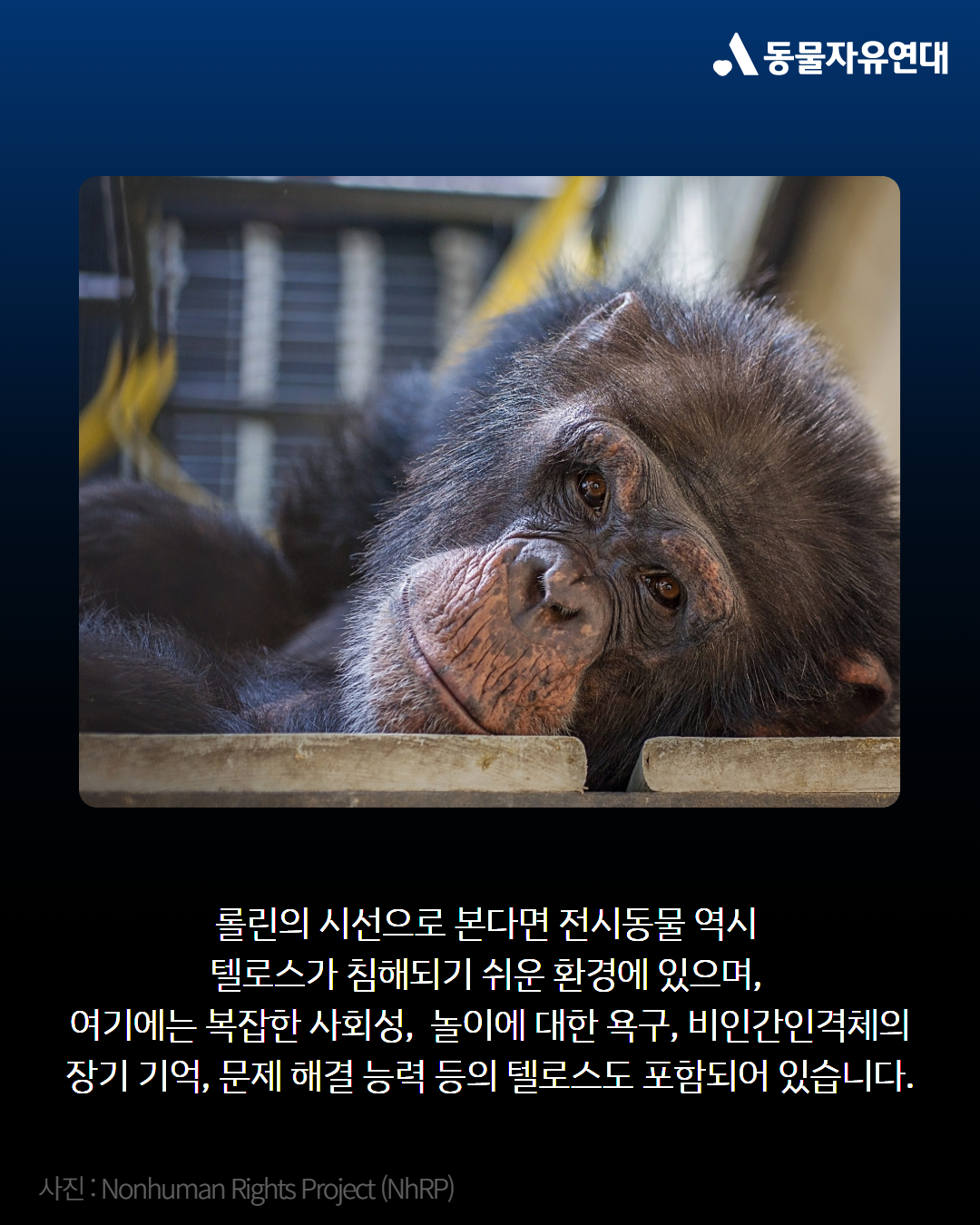 롤린의 주장에 따라 전시동물에 대해 생각해보면 어떨까요? 전시되는 비인간동물은 자기 종답게 살기 위한 텔로스가 있고, 여기에는 복잡한 사회성, 놀이에 대한 욕구, 넓은 공간에서의 이동, 침팬지, 돌고래, 코끼리 등 비인간인격체의 장기 기억, 문제 해결 능력도 포함되어 있습니다. 동물의 정형행동은 전시 환경에서 텔로스가 침해되었음을 보여주는 자연적 신호입니다.