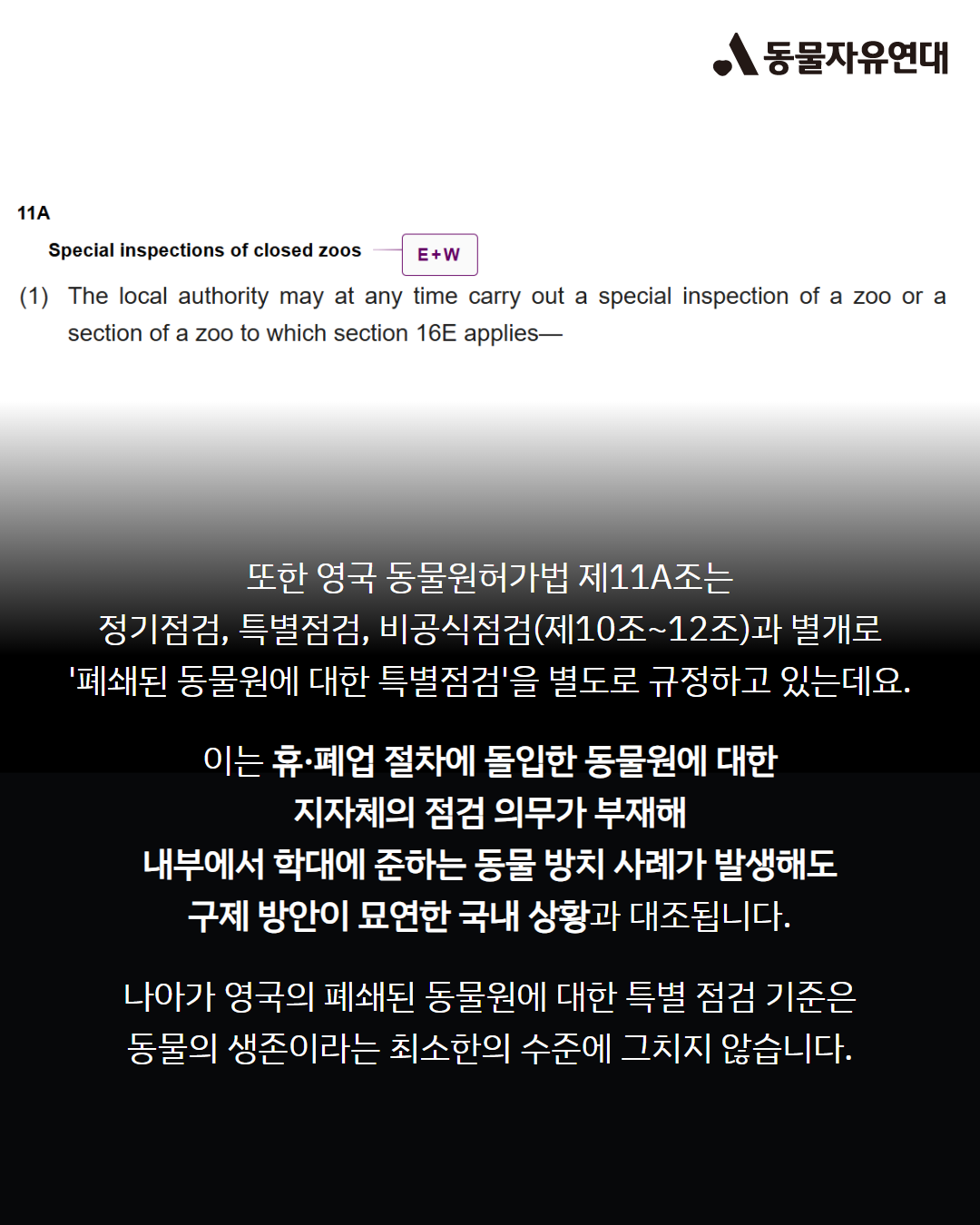또한 영국 동물원허가법 제11A조는 정기점검, 특별점검, 비공식점검(제10조~12조)과 별개로 '폐쇄된 동물원에 대한 특별점검'을 별도로 규정하고 있는데요. 이는 휴·폐업 절차에 돌입한 동물원에 대한 지자체의 점검 의무가 부재해 내부에서 학대에 준하는 동물 방치 사례가 발생해도 구제 방안이 묘연한 국내 상황과 대조됩니다. 나아가 영국의 폐쇄된 동물원에 대한 특별 점검 기준은 동물의 생존이라는 최소한의 수준에 그치지 않습니다.