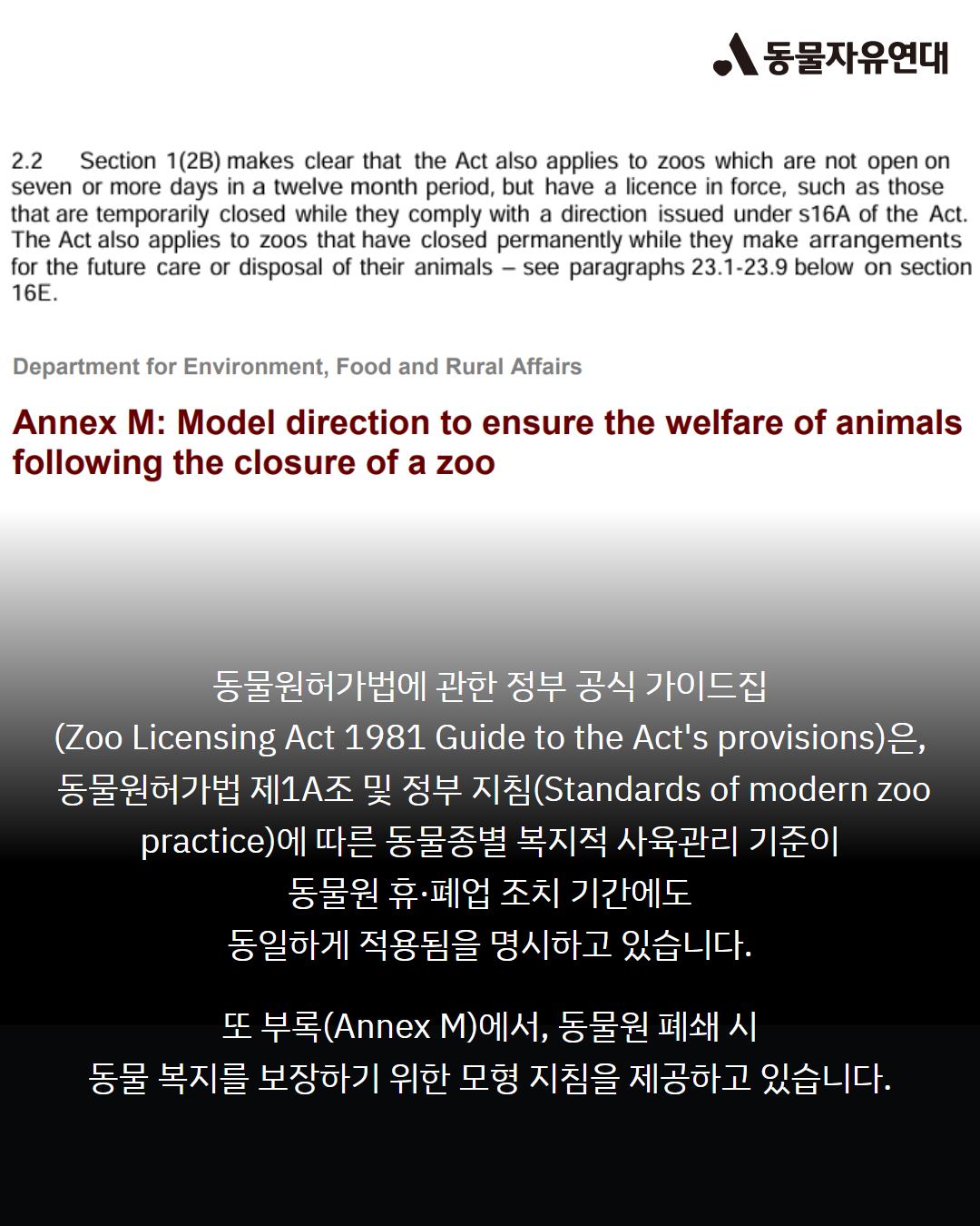 동물원허가법에 관한 정부 공식 가이드집(Zoo Licensing Act 1981 Guide to the Act's provisions)은, 동물원허가법 제1A조 및 정부 지침(Standards of modern zoo practice)에 따른 동물종별 복지적 사육관리 기준이 동물원 휴·폐업 조치 기간에도 동일하게 적용됨을 명시하고 있습니다. 또 부록(Annex M)에서, 동물원 폐쇄 시 동물 복지를 보장하기 위한 모형 지침을 제공하고 있습니다.