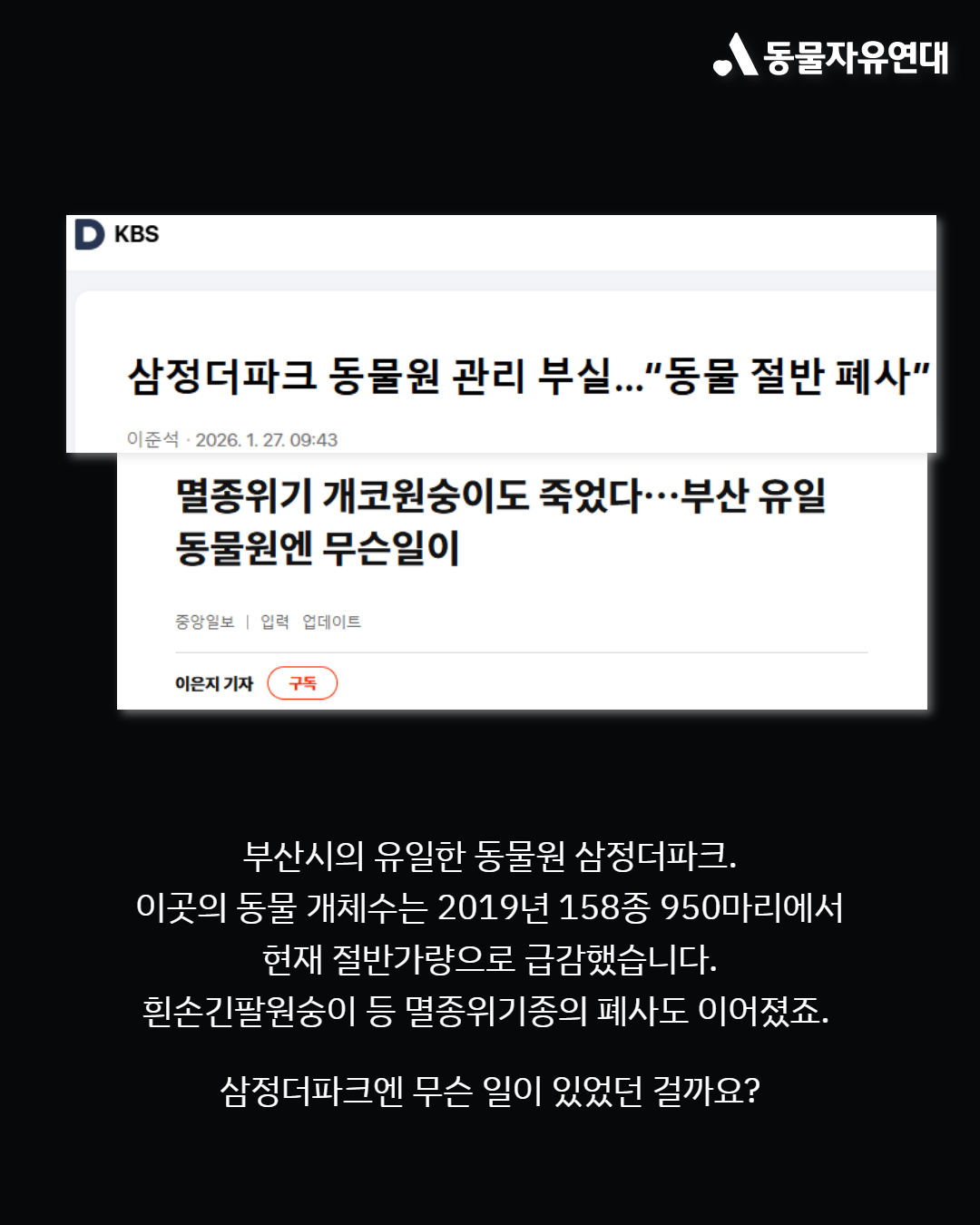 최근 부산시는 지리한 법정 공방 끝에 삼정더파크 인수를 결정하고 연내 임시 개관을 목표로 하고 있습니다. 이번 사건이 일회성 수습에 그쳐서는 안됩니다. 2023년 많은 이들의 공분을 일으켰던 '갈비사자' 바람이 사건도 코로나19 장기화로 인한 동물원 재정난이 그 배경에 있었습니다. 인간의 흥미를 위해 동물들에게서 야생을 빼앗고 감금하기로 결정했다면, 이에 상응하는 책임 또한 끝까지 지는 성숙한 사회가 되기를 동물자유연대는 강력히 촉구합니다.