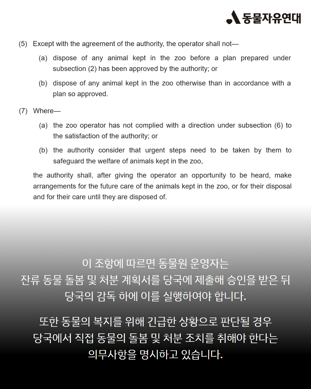 이와 대조적으로 영국 동물원 허가법(Zoo Licensing Act 1981) 제16E조는 동물원 폐쇄 이후 동물복지에 관한 운영자와 지자체의 의무를 상술하고 있습니다. 이 조항에 따르면 동물원 운영자는 잔류 동물 돌봄 및 처분 계획서를 당국에 제출해 승인을 받은 뒤 당국의 감독 하에 이를 실행하여야 합니다. 또한 동물의 복지를 위해 긴급한 상황으로 판단될 경우 당국에서 직접 동물의 돌봄 및 처분 조치를 취해야 한다는 의무사항을 명시하고 있습니다.