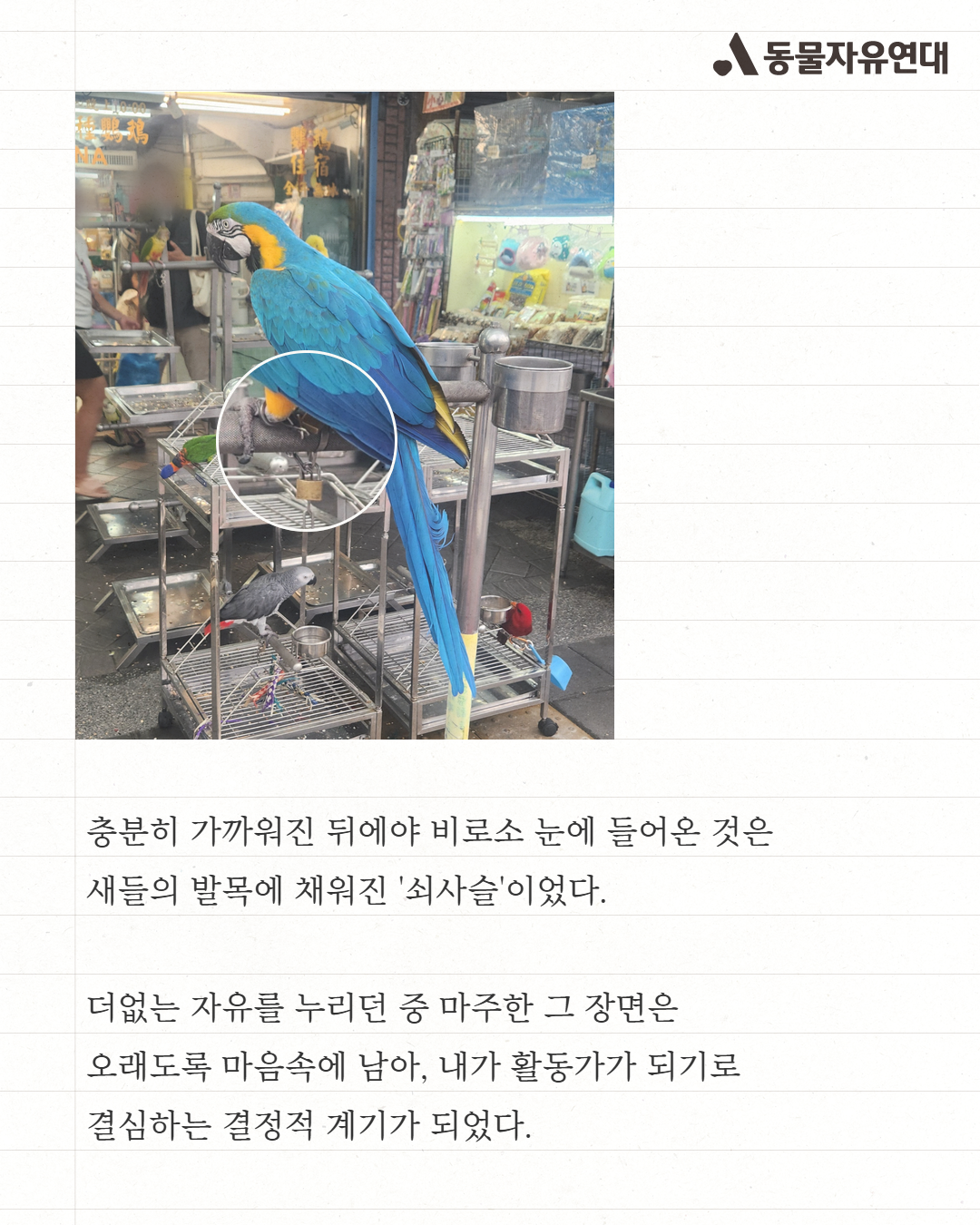 충분히 가까워진 뒤에야 비로소 눈에 들어온 것은 새들의 발목에 채워진 '쇠사슬'이었다. 더없는 자유를 누리던 중 마주한 그 장면은 오래도록 마음속에 남아, 내가 활동가가 되기로 결심하는 결정적 계기가 되었다.