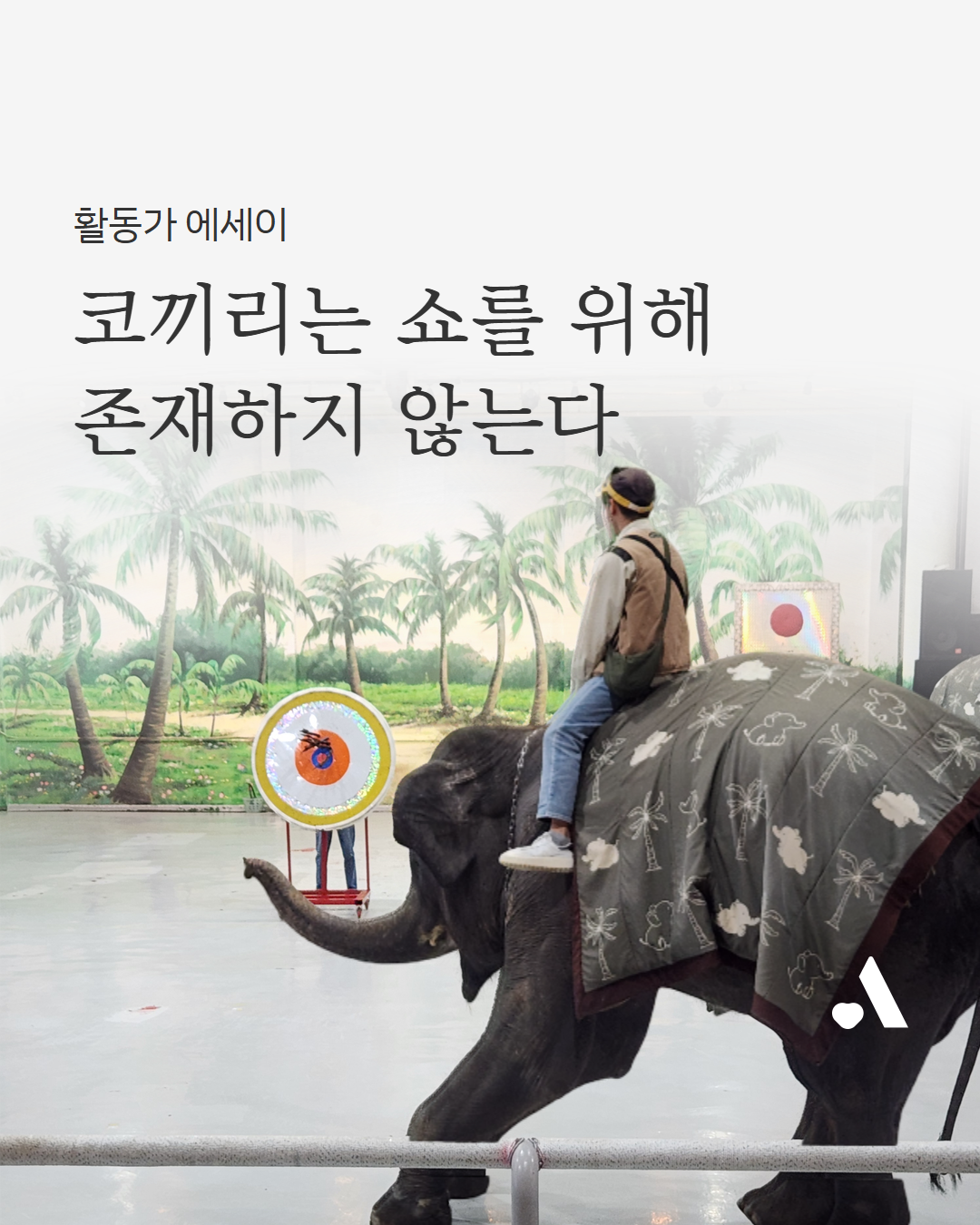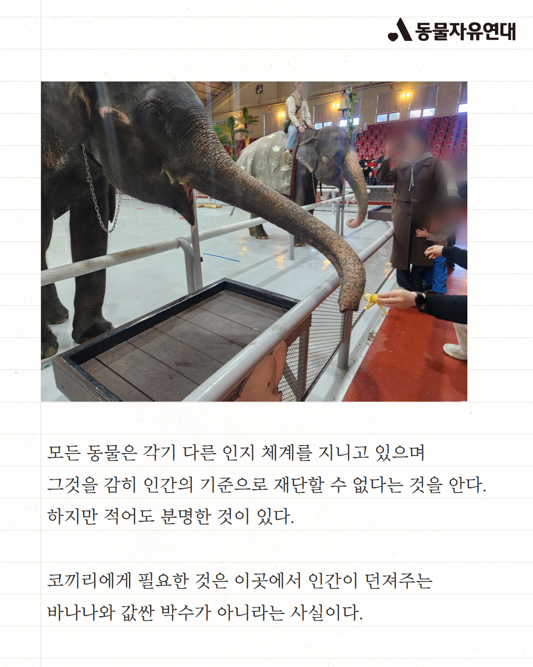 모든 동물은 각기 다른 인지 체계를 지니고 있으며 그것을 감히 인간의 기준으로 재단할 수 없다는 것을 안다. 하지만 적어도 분명한 것이 있다. 코끼리에게 필요한 것은 이곳에서 인간이 던져주는 바나나와 값싼 박수가 아니라는 사실이다.