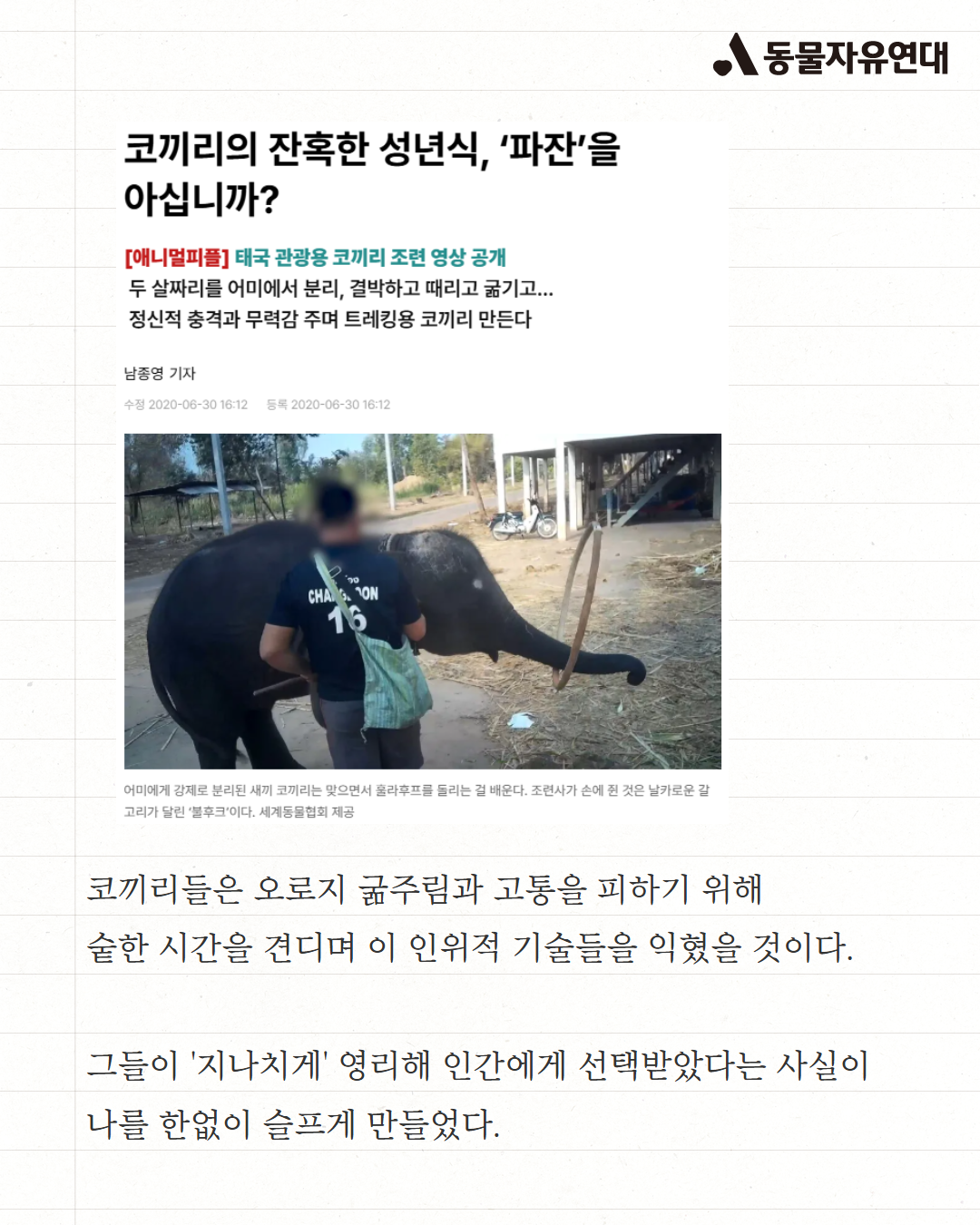 철학자 마사 누스바움은 비인간 동물에게도 저마다의 역량을 발휘할 기회가 필요하다고 말했다. 배부르고 따뜻한 것만으로는 충분하지 않다. 광활한 초원, 거대한 동료집단. 자유. 유인원과 함께 '비인간인격체'로 분류될만큼 고도화된 사고를 하는 코끼리에게, 이곳은 그저 끔찍한 학대 현장일 뿐이다.